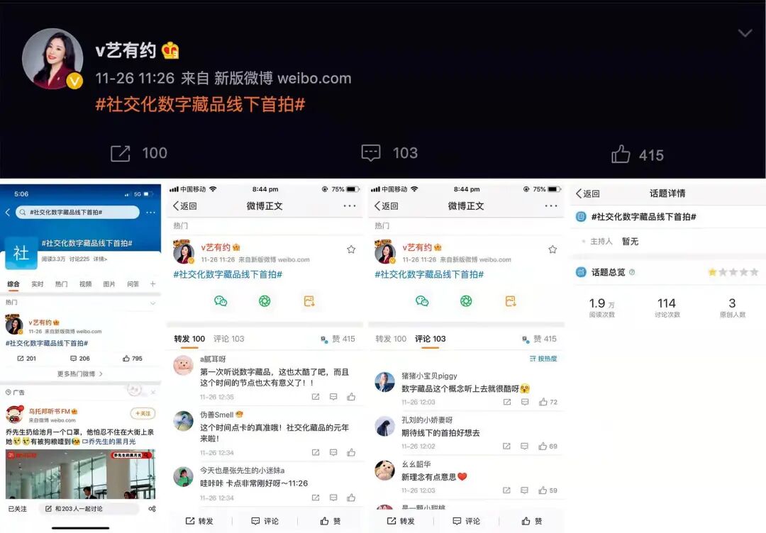 微博账号@V艺有约将“社交化数字藏品线下首拍”的新闻通过微博进行发布,并建立了相关话题,起潮时代的相关上拍艺术品的发布以及拍卖情况都将在这个话题内进行线上社交化讨论。这条新闻将通过TopHolder平台记录到区块链上,作为“社交化数字藏品线下首拍”的微博新闻以及第一个将社交新闻的数字收藏进行拍卖,这个特殊拍品都具备独特的收藏价值。