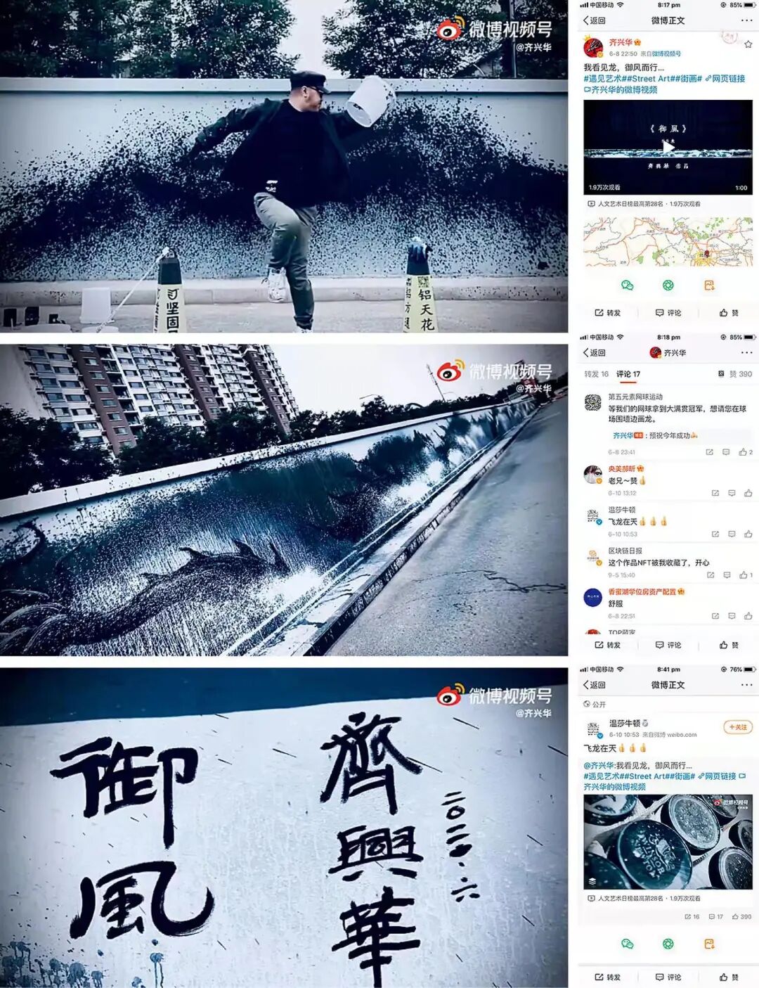 该作品是中国首位3D街画艺术家齐兴华在2021年在北京的创作。整体墙面3.5米高,88米长;齐兴华采用其标志性的泼墨街画创作手法,创作出一幅墨龙御风而行的作品。