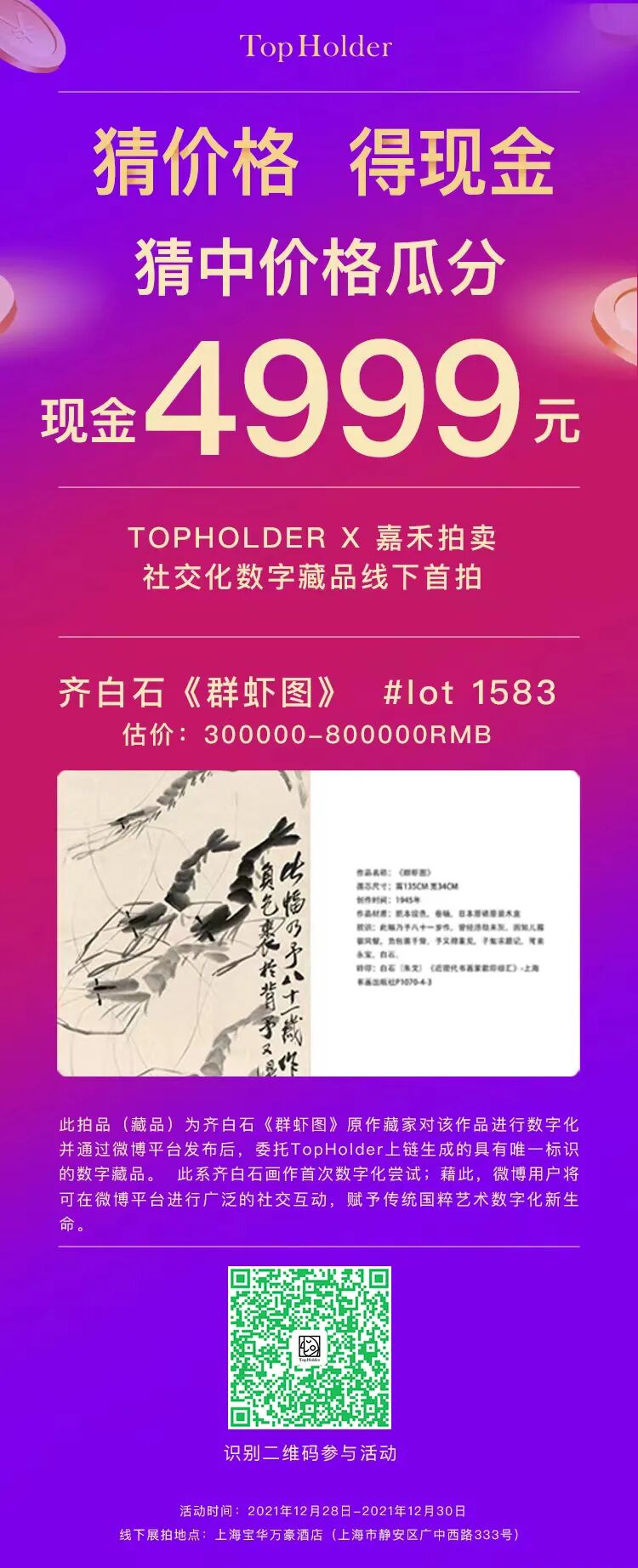 TopHolder官方还组织了猜价格得现价小游戏,猜中拍卖价格,就可以分24995元现金,大家扫描下方二维码,一起来参与一下吧!