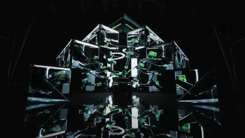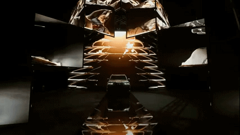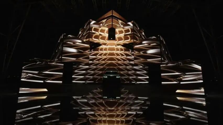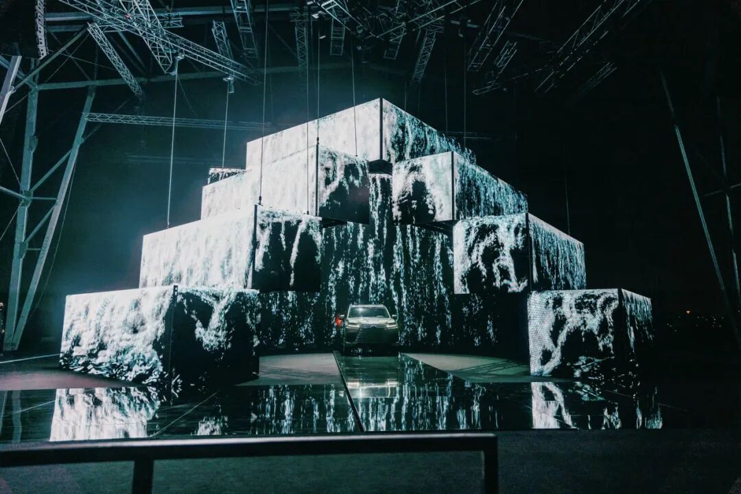 团队考虑到当地建筑、习俗和传统,设计了一个多媒体金字塔来衬托汽车。这个金字塔与地板上的屏幕融合在一起,形成令人惊叹的、令人印象深刻的视觉效果。除了沙漠,还有机械臂的使用增加了科技感。手、水,等元素将汽车这一看似冰冷的实物柔性化处理,巧妙输出雷克萨斯品牌意义。当后屏幕拉开,汽车进入金字塔,伴随着视觉内容,你能感受到这是一场科技与人文融合的发布会。