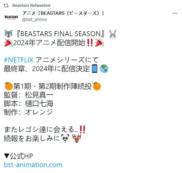 官方宣布TV动画《BEASTARS》最终季(BEASTARS FINAL SEASON)将在2024年播出。最终季延续了前2季的制作阵容,监督为松见真一,编剧为樋口七海,制作为Orange。