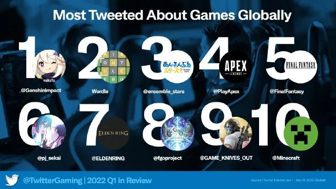 推特发布了自家平台2022年第一季度(1月至3月)的全球话题度最高游戏Top10,《原神》凭借超高人气继续位列第一,基于浏览器的文字游戏《Wordle》排在了第二,《偶像梦幻祭》和《Apex英雄》分列三四位。而发售不久的《艾尔登法环》虽然人气不错,但是也仅位列第七。