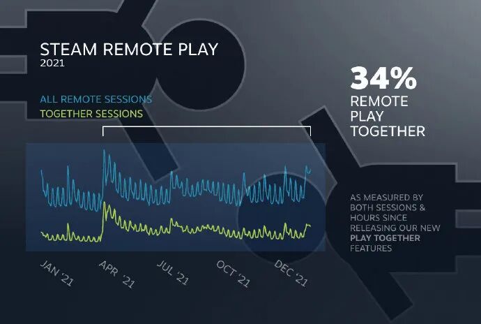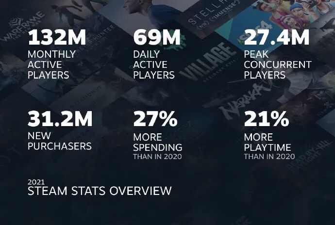 Steam官方回顾了2021年Steam上推出的重大更新、全新功能和相关数据,其中玩家们 2021 年在 Steam 上流连了将近 380 亿小时(430万年)——比 2020 年增长了 21%。
