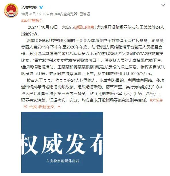 六安检察发布了一则关于《DOTA 2》网络赌博的案件播报。播报显示,2021年10月19日,六安市霍山检察以涉嫌开设赌场罪依法对王某某等24人提起公诉。