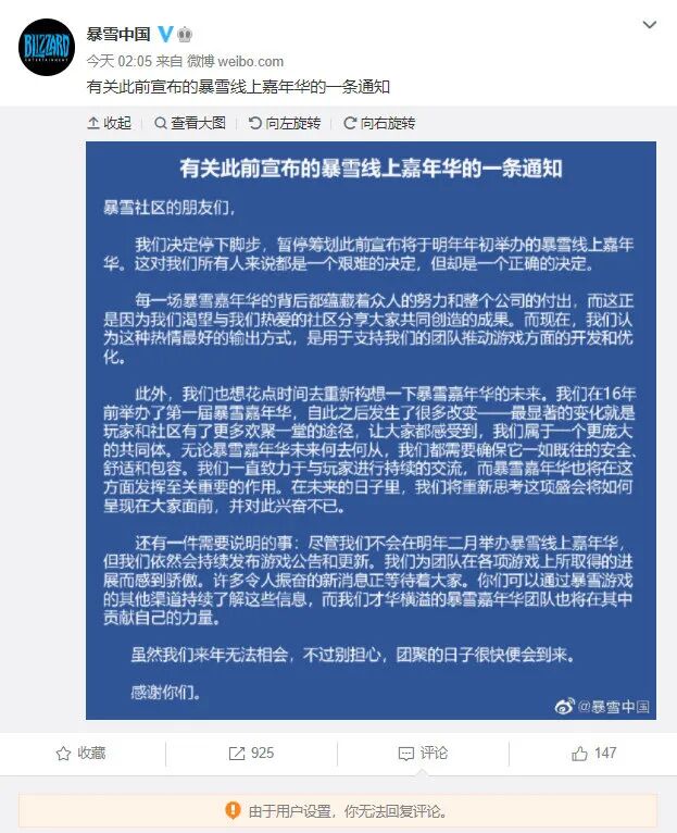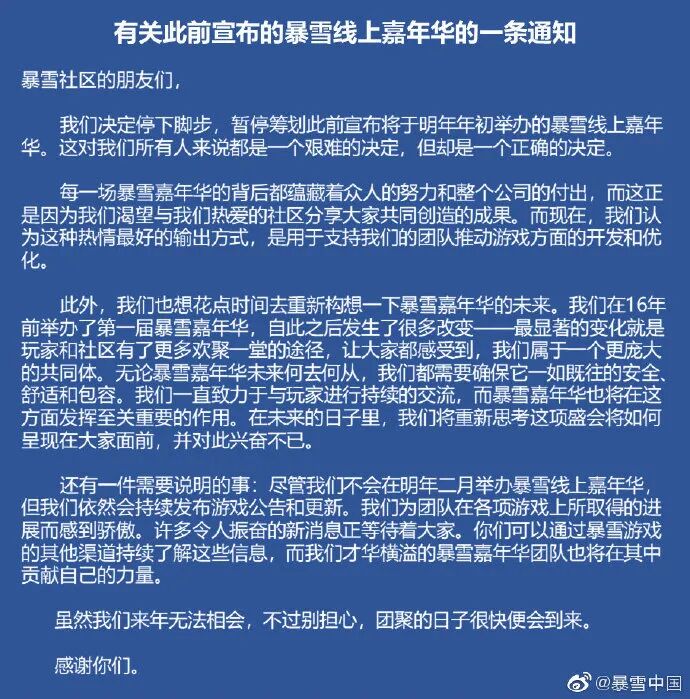 在公告中,暴雪表示他们将会花点时间去重新构想一下暴雪嘉年华的未来,让暴雪嘉年华变成一个让所有人“放心、热情和包容”的活动。