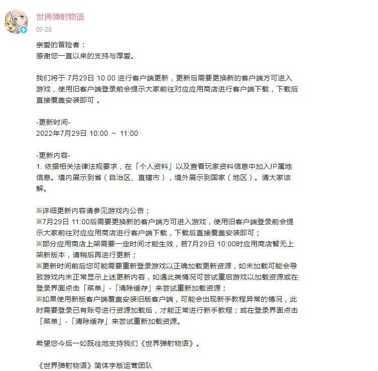 雷霆旗下手游《世界弹射物语》发布公告:依据相关法律法规要求,在「个人资料」以及查看玩家资料信息中加入IP属地信息。境内展示到省(自治区、直辖市),境外展示到国家(地区)。此外也有不少玩家发现,手游《奥比岛》也在游戏的个人资料页面中更新了显示IP归属地。