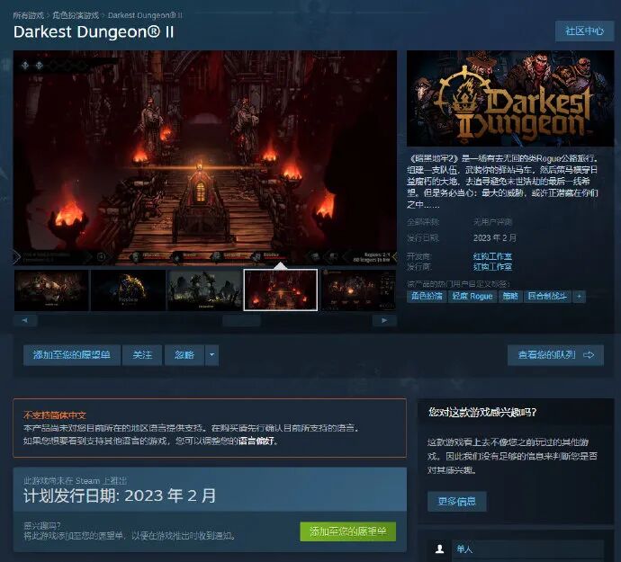 类Rogue回合制RPG《暗黑地牢2》现已上线Steam平台,游戏将于2023年2月结束Epic限时独占,在Steam正式发售,暂未显示支持中文。