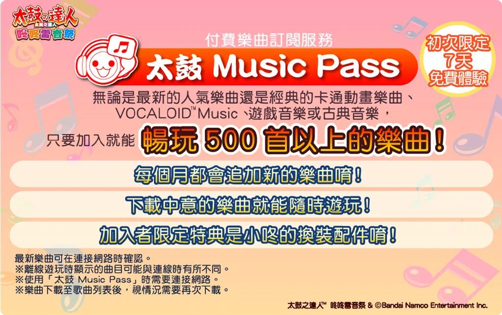 本作收录“塞尔达传说 主题曲”“ 红莲华”“ Feel Special”“ 夜に駆ける”等76首曲目,购买“太鼓音乐通行证”还可享超过500首曲目和每月新曲更新。