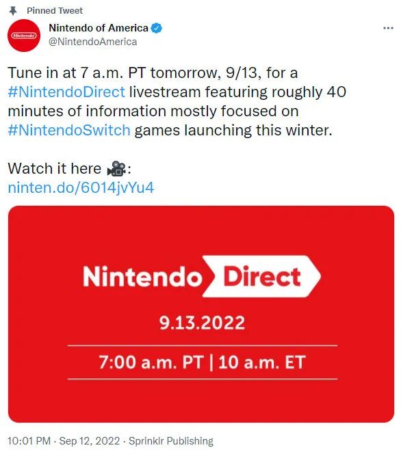 任天堂美国宣布将于太平洋时间9月13日上午7点(北京时间晚10点)带来一场新的直面会。直面会时长约为40分钟,将会带来预计在今年冬季发售的游戏信息。