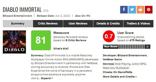 《暗黑破坏神:不朽》国际版近日已上线海外地区,MC评分已解禁,媒体均分81,玩家评分仅有0.7。在MC的475个玩家评价中,可以看出游戏内置的微交易系统就是玩家们给出差评的主要原因。