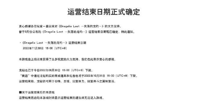 由Cygames设计并和任天堂联合开发与运营的手游《Dragalia Lost ~失落的龙约~》在今年3月份就宣布游戏将停止运营,不过停运时间未定。官方发布公告宣布,游戏将于北京时间2022年11月30日14:00正式停止运营。运营结束后再启动游戏将显示运营结束的通知并无法进入游戏。