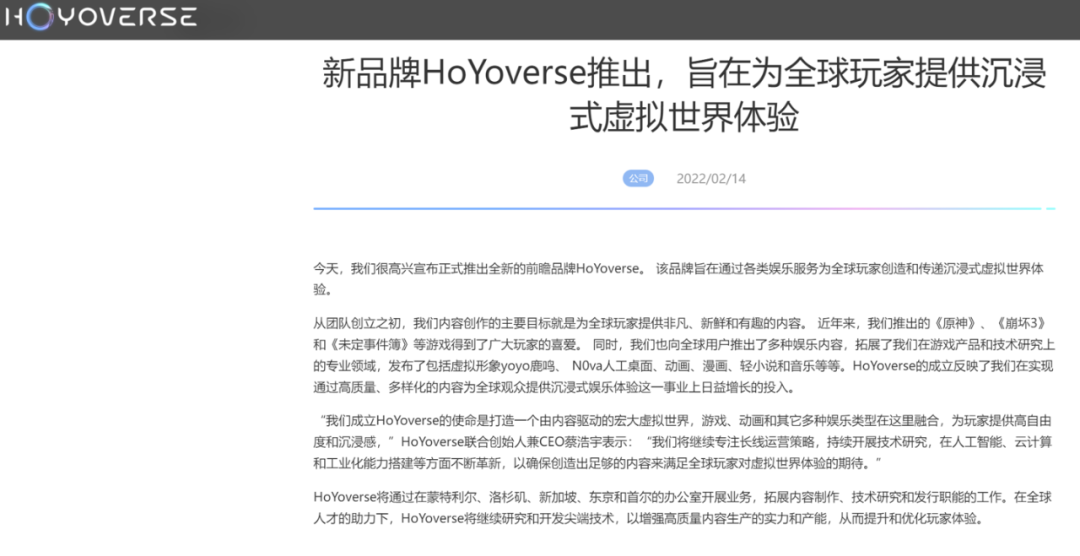 据Hoyoverse官方发布的公告表示,该品牌旨在通过各类娱乐服务为全球玩家创造和传递沉浸式虚拟世界体验,为全球玩家提供非凡、新鲜和有趣的内容。