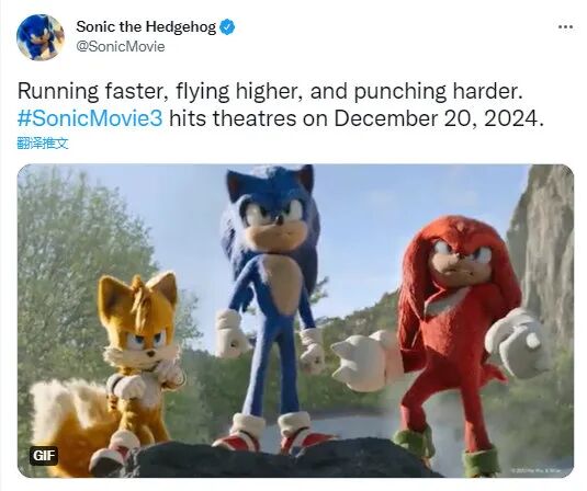 游戏改编电影《刺猬索尼克3》正式定档,影片将于2024年12月20日在北美地区上映,跑得很快的蓝色刺猬回归了。该系列前两部票房出色,共拿下7.21亿美元全球票房。
