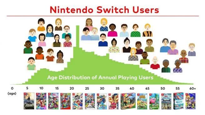 任天堂官方公布Switch年度游戏用户年龄分布的最新报告,从儿童到老年人,Switch的用户类型五花八门。在过去的一年里,所有年龄层的年游戏用户数量都在增长。在截止2022年9月的一年时间里,有超过1亿位用户游玩过Switch游戏。