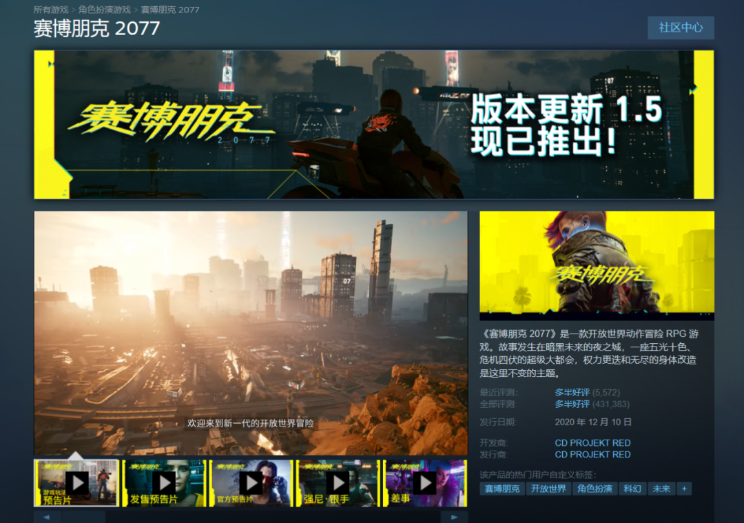不仅游戏内容有更新,就连《赛博朋克》的Steam商城页面也是焕然一新,进入页面映入眼帘的便是“版本更新1.5现已推出”几个大字。