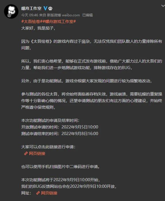 《太吾绘卷》官方宣布,游戏将开启功能测试申请,制作人“茄子”表示:由于游戏内容过于庞杂,无法仅凭团队数人的力量排除所有问题,因此希望在能够正式发布游戏前,借助玩家们的力量,来帮助其测试游戏功能,排除存在的BUG。