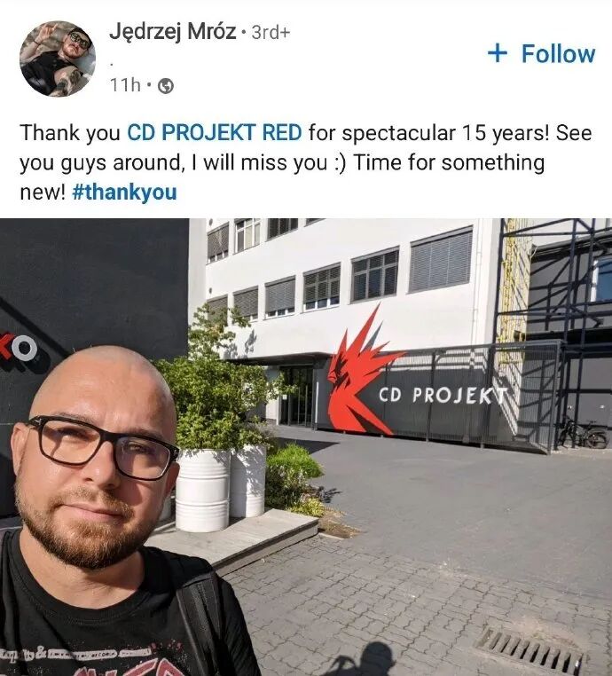 据领英动态显示,《赛博朋克2077》的制作总监Jędrzej Mróz宣布已从工作15年的CDPR离职,其任职期间曾参与《赛博朋克2077》《巫师》系列游戏的开发。