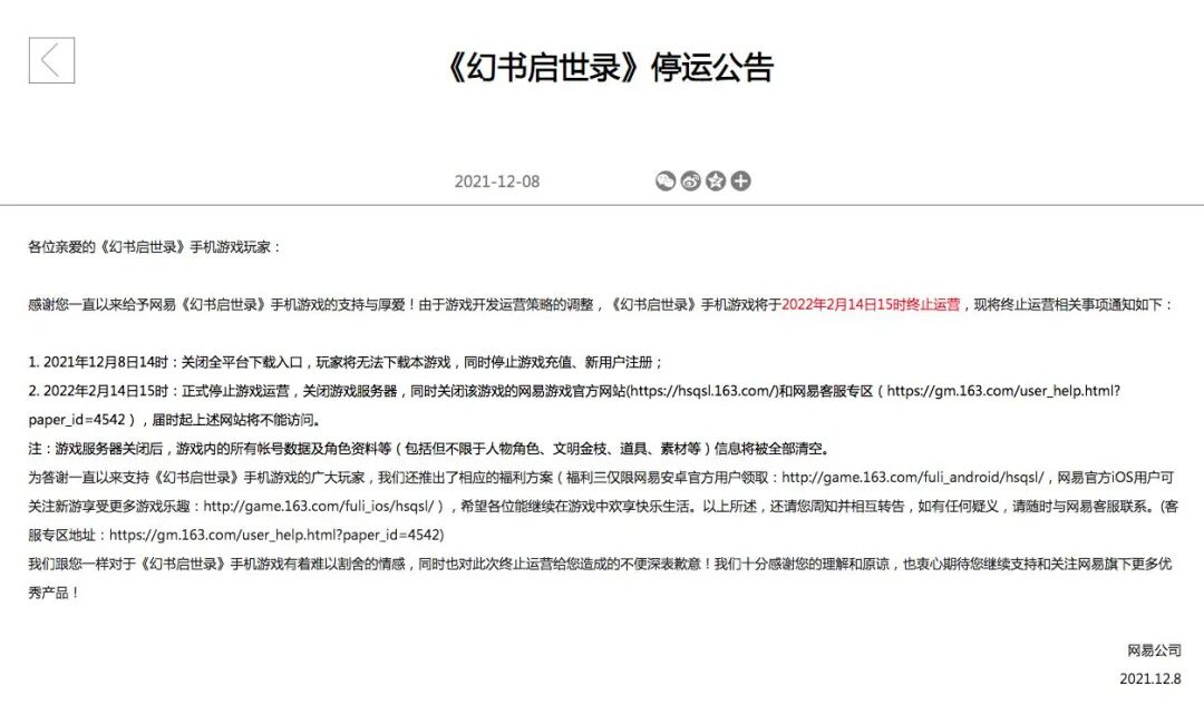 网易手游《幻书启世录》近日发布停运公告。由于游戏开发运营策略的调整,《幻书启世录》将于2021年12月8日14时关闭全平台下载入口,同时停止游戏充值、新用户注册,并于2022年2月14日15时正式终止运营。
