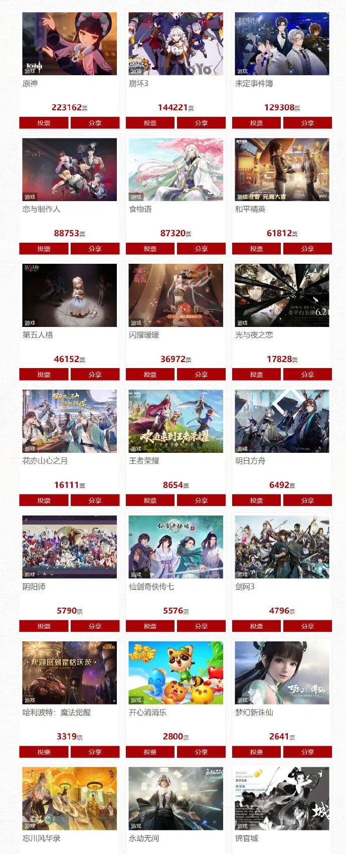 近日新浪财经联合新浪微博、国家版权交易中心联席会议,在中宣部版权管理局的指导下,开启了2021年十大年度国家IP评选投票,投票将于3月25日结束,4月26日进行颁奖。其中在游戏类别中,目前《原神》《崩坏3》得票数分别位于第一和第二,《仙剑奇侠传7》位于第14位,《永劫无间》位于第20位,《戴森球计划》位于第25位。