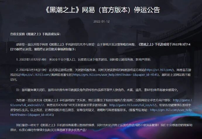 网易旗下都市异能战斗手游《黑潮之上》官方发布公告表示,由于游戏开发运营策略的调整,《黑潮之上》手机游戏将于2022年3月14日15时终止运营。