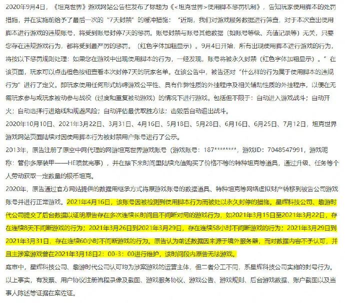 文书显示,被告两公司自2020年获授权正式运营涉案网游《坦克世界》期间,程某账号因被检测到使用脚本行为,被处以永久封停的措施。被告两公司提交了后台数据,证明原告存在多次连续长时间且不间断对局的游戏行为,如连续8天不间断游戏的行为等。
