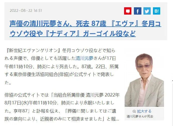 日本声优清川元梦于8月17日因肺炎去世,享年 87 岁。他曾在庵野秀明的作品中出演,担任过卡格伊(《蓝宝石之谜》)、冬月耕造(《EVA》)的配音。此外《FF14》中的路易索瓦大师、奥特曼系列中的奥特之王(《超银河传说》除外)也都是他配音的角色。