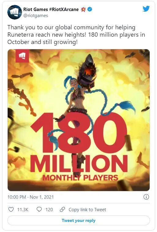 Riot Games(拳头游戏)官方推特近日宣布,《英雄联盟》相关游戏的月活跃玩家人数在10月达到了1.8亿人的峰值,并且还在不断增长中。