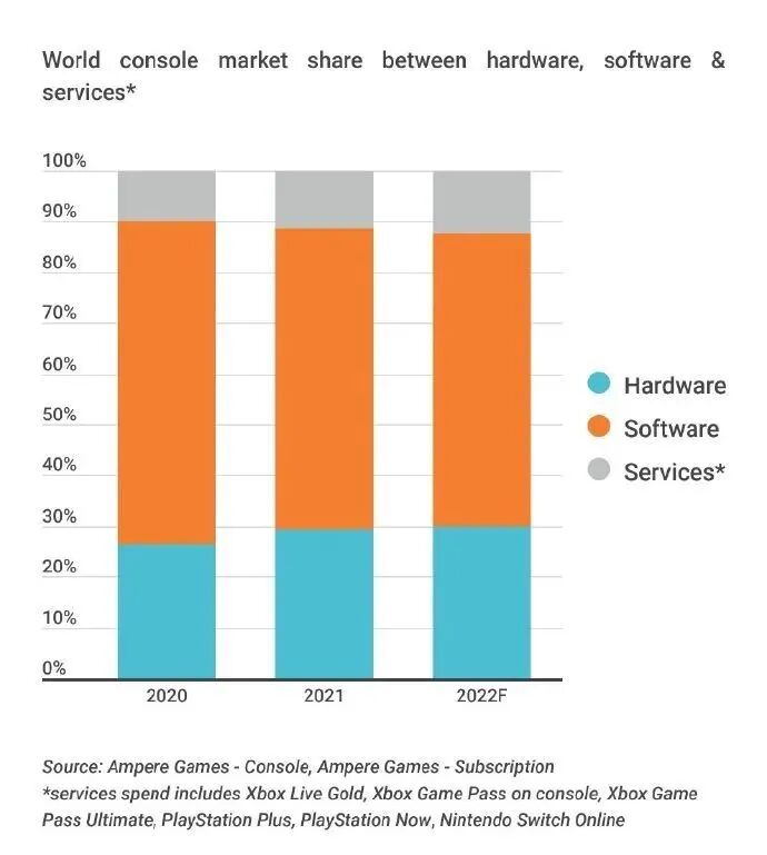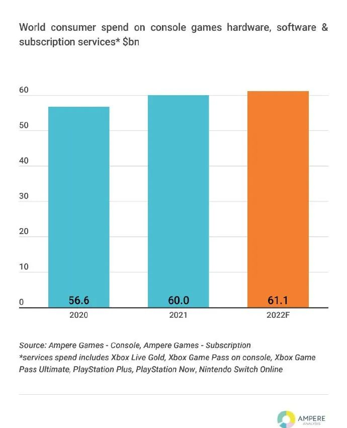 ·去年主机游戏、硬件与服务的总支出达到600亿美元,预测2022年将超过610亿,与2020年相比,游戏内容上的支出,包括完整游戏、DLC、游戏内道具、战斗通行证等保持稳定,仅下滑1%