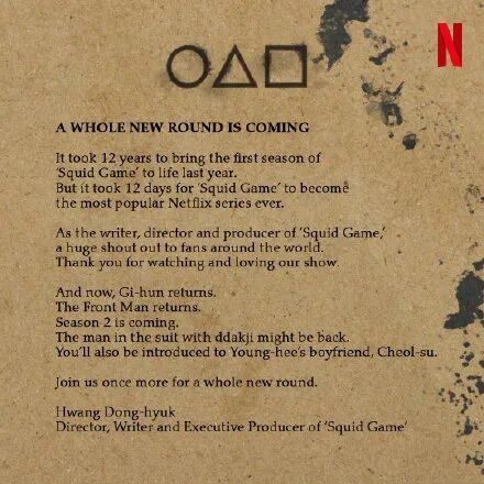 网飞官宣旗下热剧《鱿鱼游戏》将有第二季,分享续订先导视频:“红灯,绿灯!《鱿鱼游戏》将正式第二季回归!”