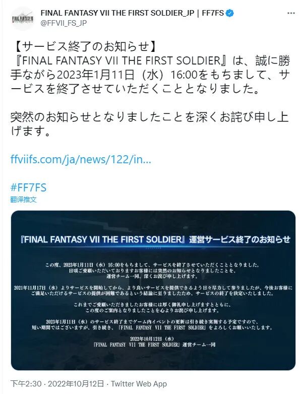 大逃杀手游《最终幻想7 THE FIRST SOLDIER》宣布将于明年1月11日停服。本作于21年11月17日上线,最终运营时间仅一年。