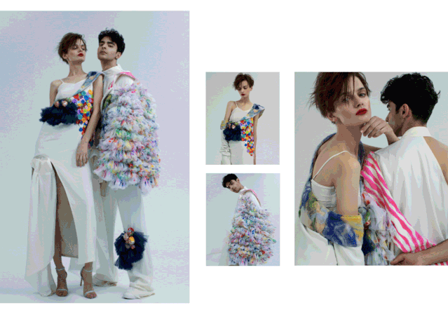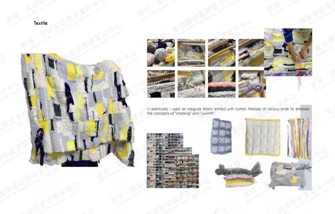 JENNIE ZHANG:我选择混合颜料、多种颜色的发泡浆来表现交融,球体来代表个体,实验了多种圆形、颜色与薄纱混合的面料改造。我还利用了多种样式的棉线编织出无规律的面料来表现“堆积”和“温暖”的概念。
