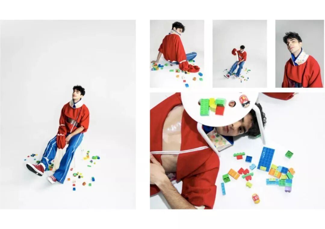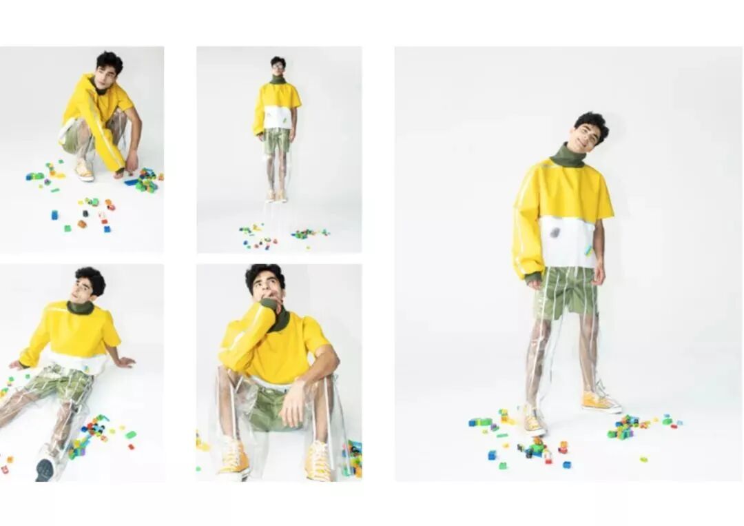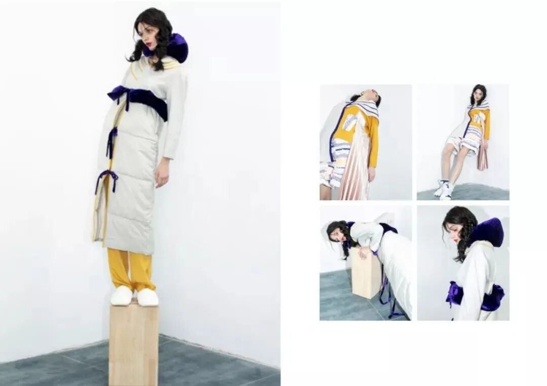 这个系列以我弟弟幼儿园时期的乐高玩具和恐龙睡衣,以及中国小学生的校服、眼镜、堆积的教科书和因为久坐产生变形的脊椎为元素展开。主要款式来源于中国式校服肥大不合体的样式,在此基础上设计不断变形夸大的廓形。