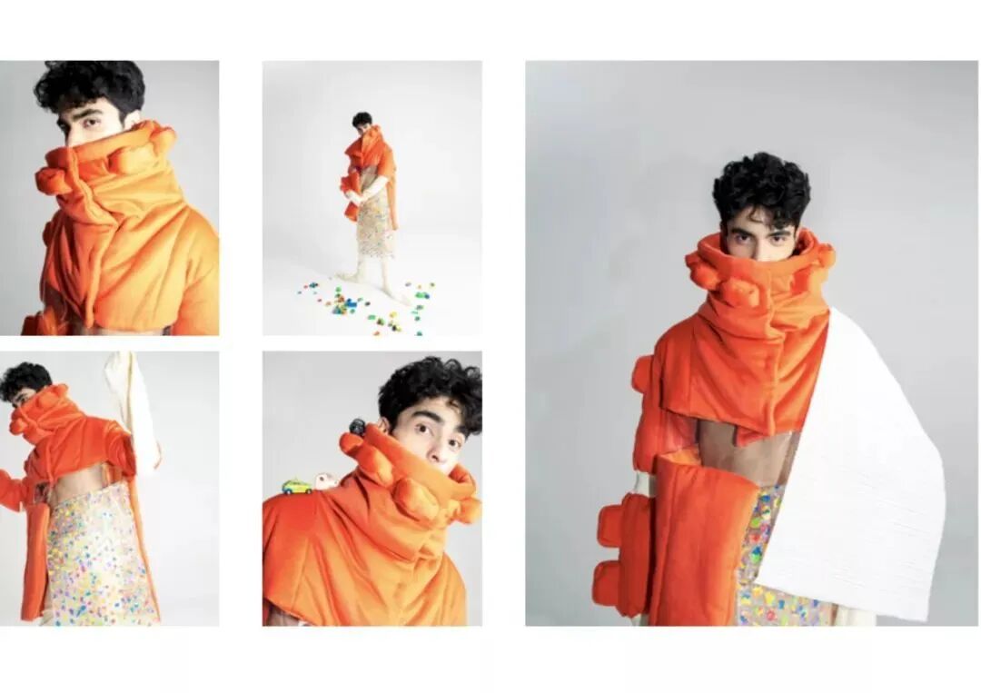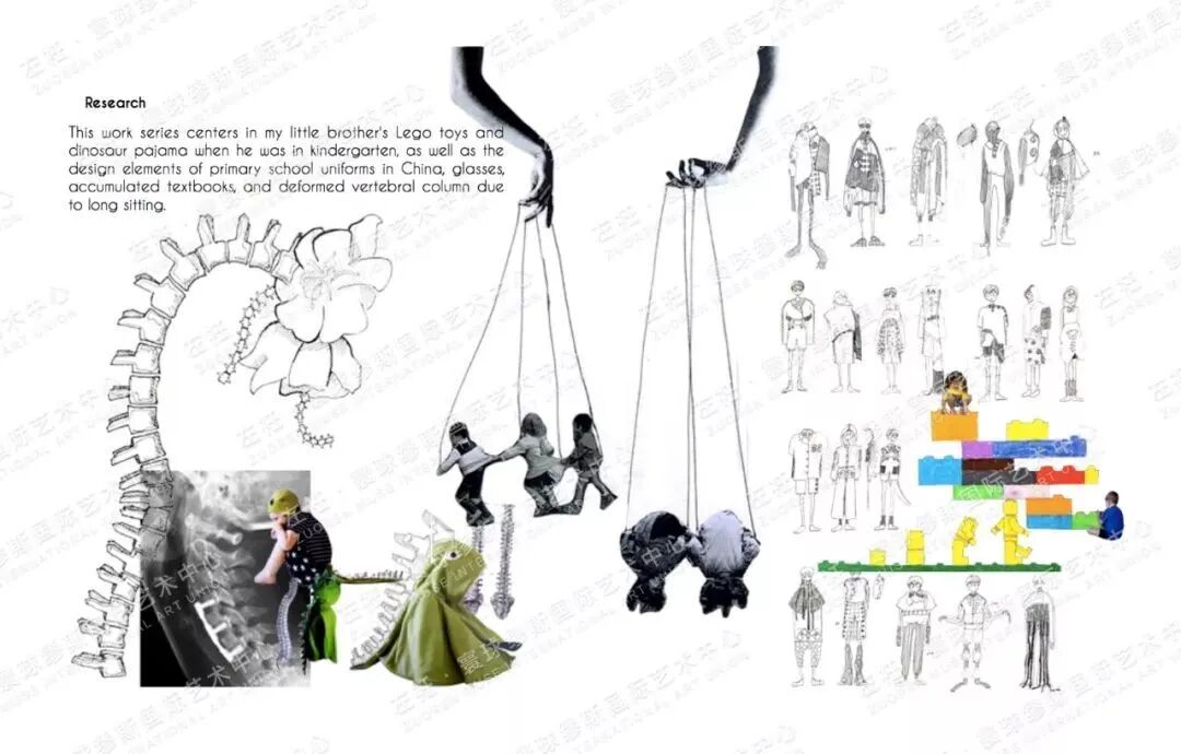 乐高玩具店内的装饰墙面转化为面料改造:将彩色海绵纸剪碎装到泡泡纸里。在AB胶里镶入乐高玩具和课本碎片作为镜片装饰,乐高玩具变成恐龙睡衣上的犄角,按照脊椎图案的形状排列,表现在繁重的学习压力下孩子变得极易敏感的内心和身体上的伤害。颜色采取了红黄蓝绿橙等彩色,来展现孩子应该有的童年生活。