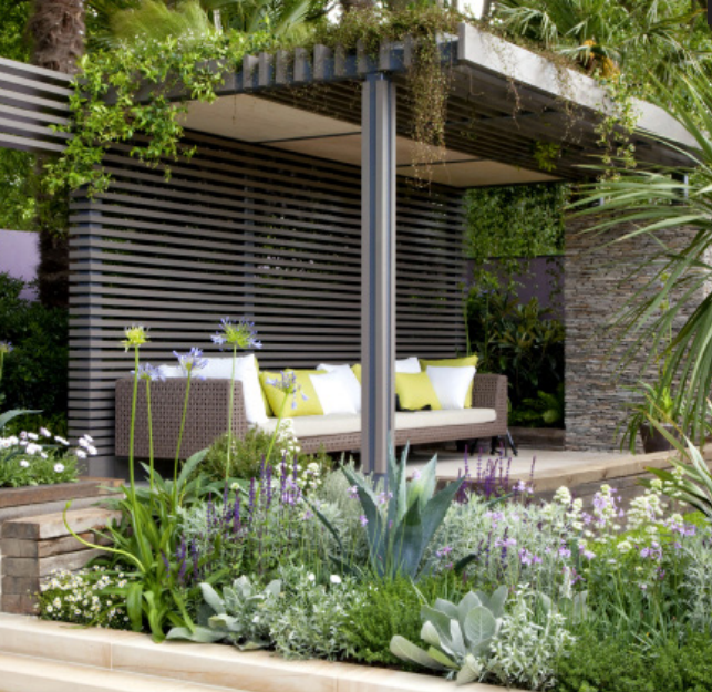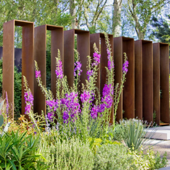 水平栅栏板不仅为植物提供了完美的背景,还会让花园显得更大。