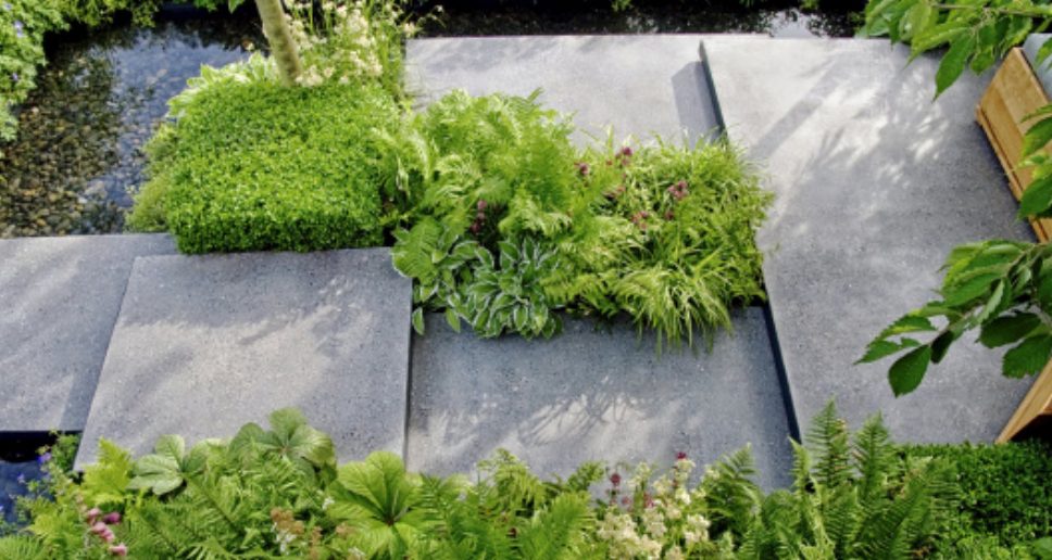 浇筑混凝土板赋予这种错落台地一种现代感,创造出光滑、反光的表面。