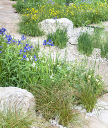 光滑铺装的层列式图案沿着路径的方向吸引视线,而不规则的边缘被植物和卵石柔化。
