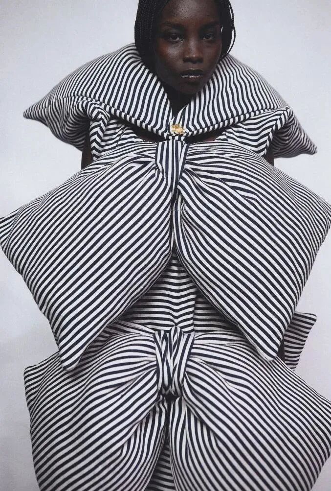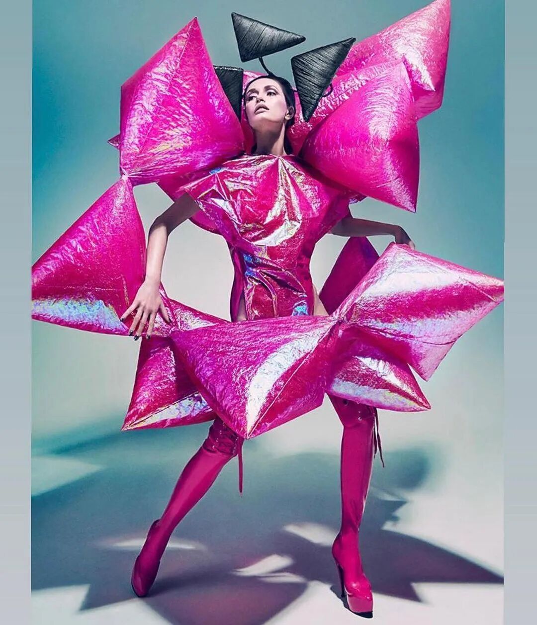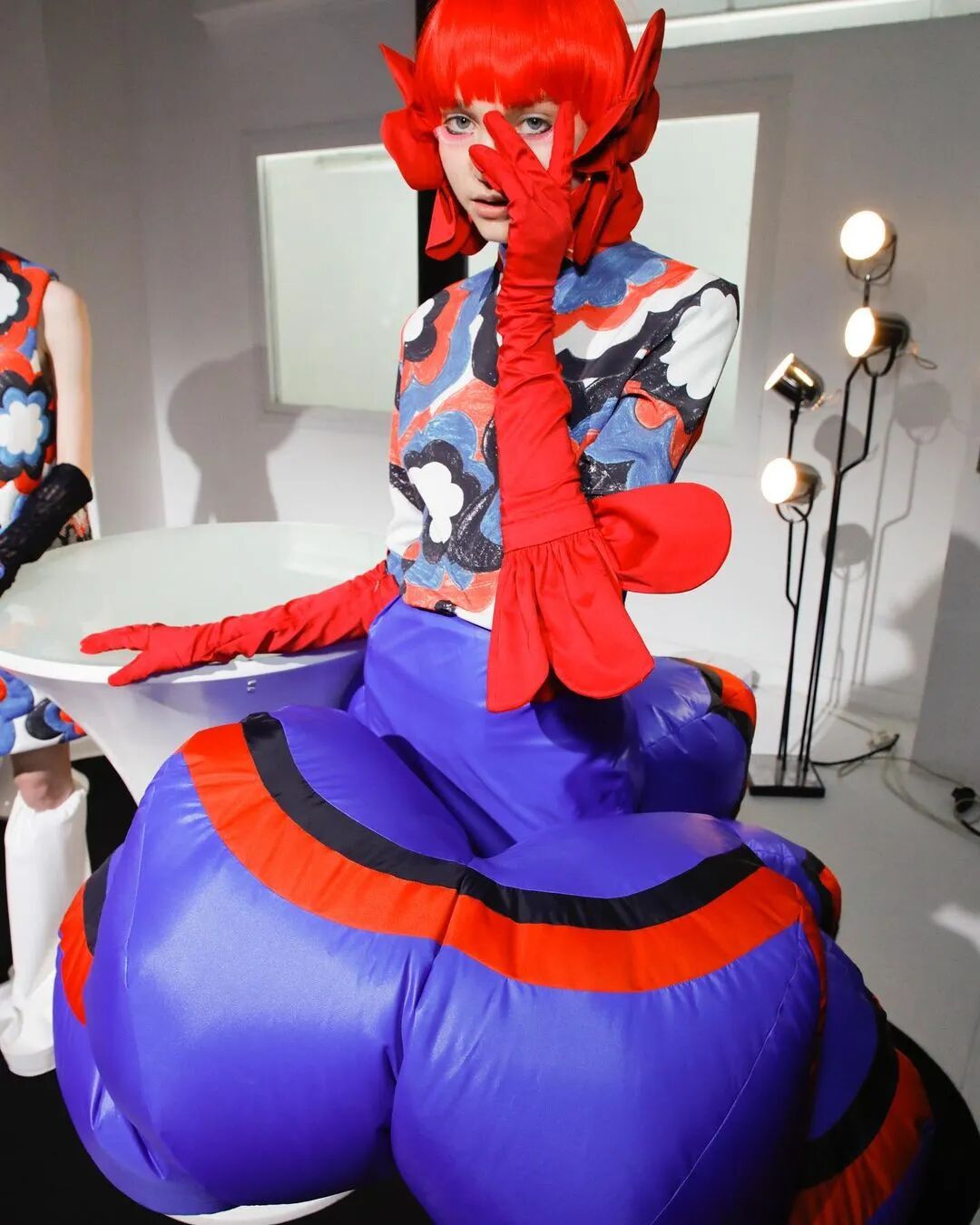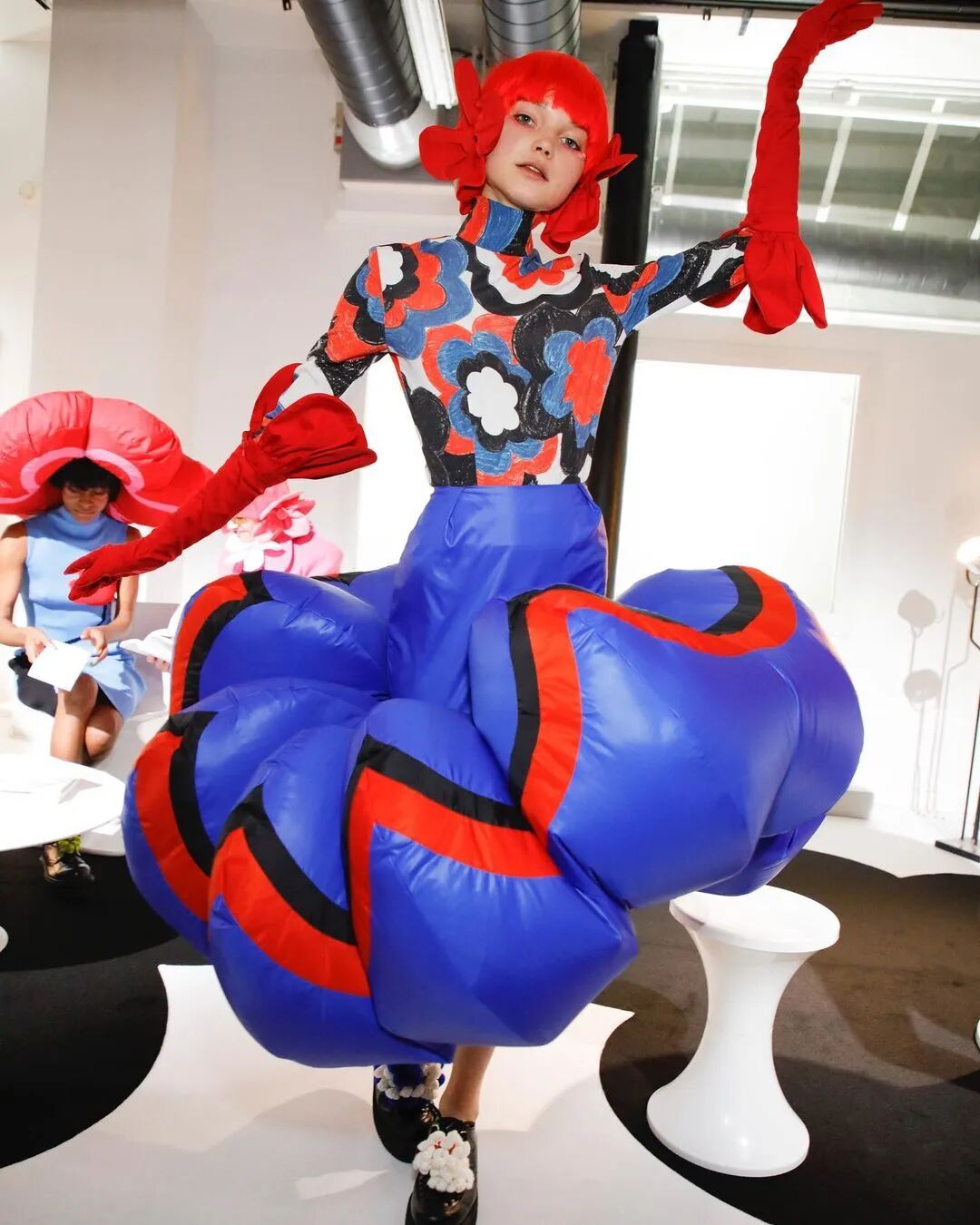 如果 Chupa Chups、Rainbow Brite 和充气家具一起开始制作衣服,其结果可能就像 Celine Kwan 正在构建的欢乐的时尚世界。这位中央圣马丁学院的毕业生从一开始就希望创造出轻盈和可穿戴的雕塑,它们还拥有充气的特殊能力,这就是她的 LivingRoom Utopia 系列。