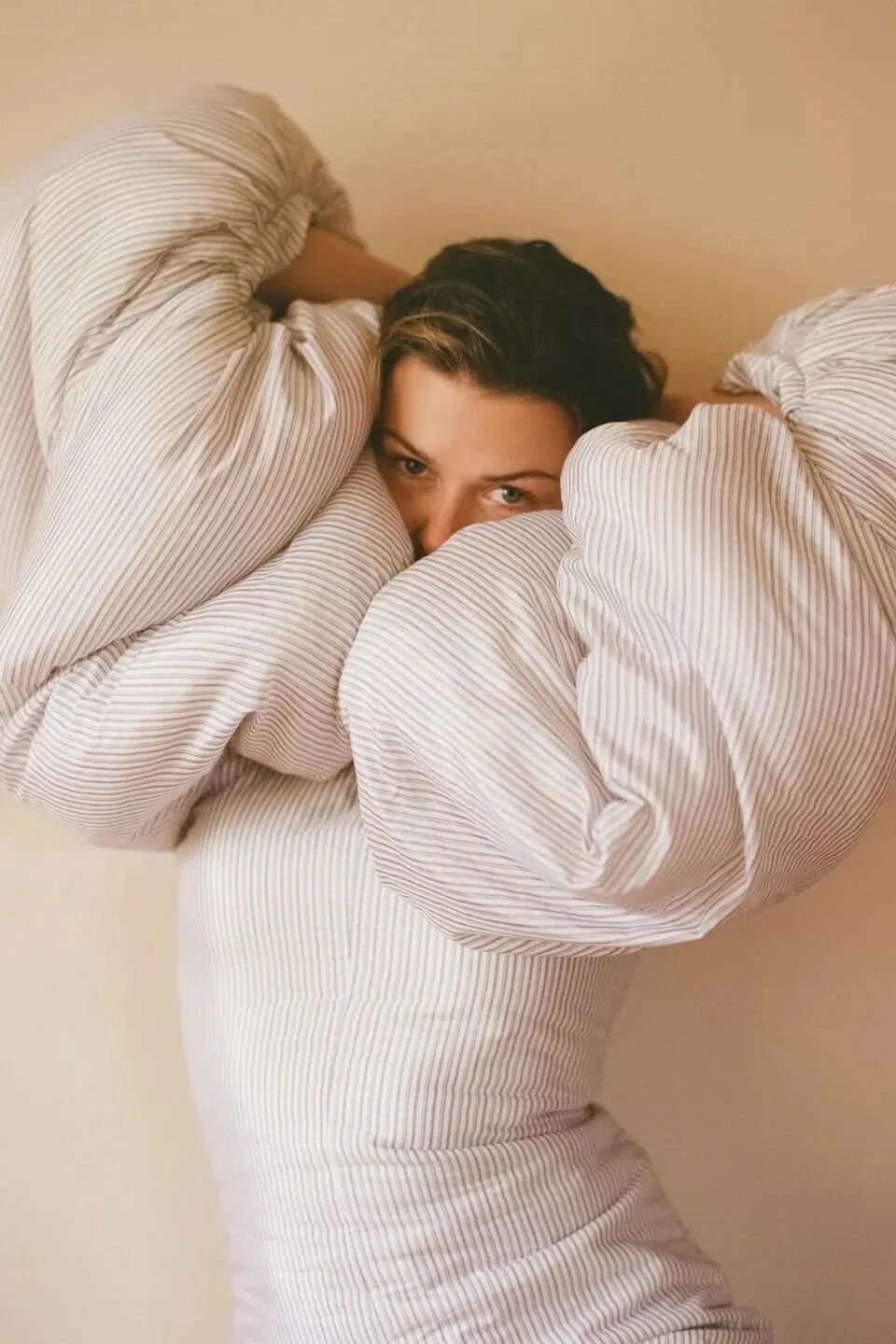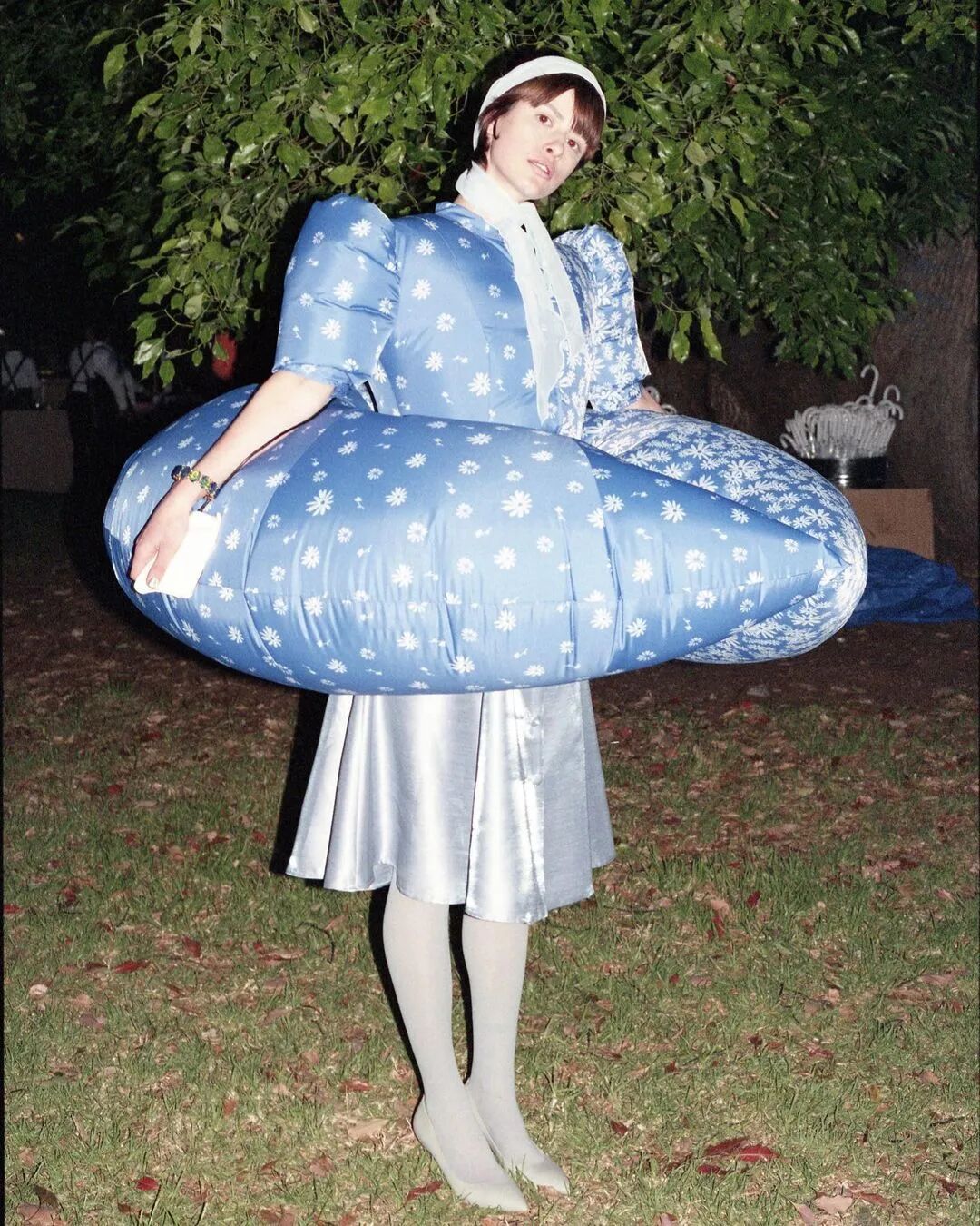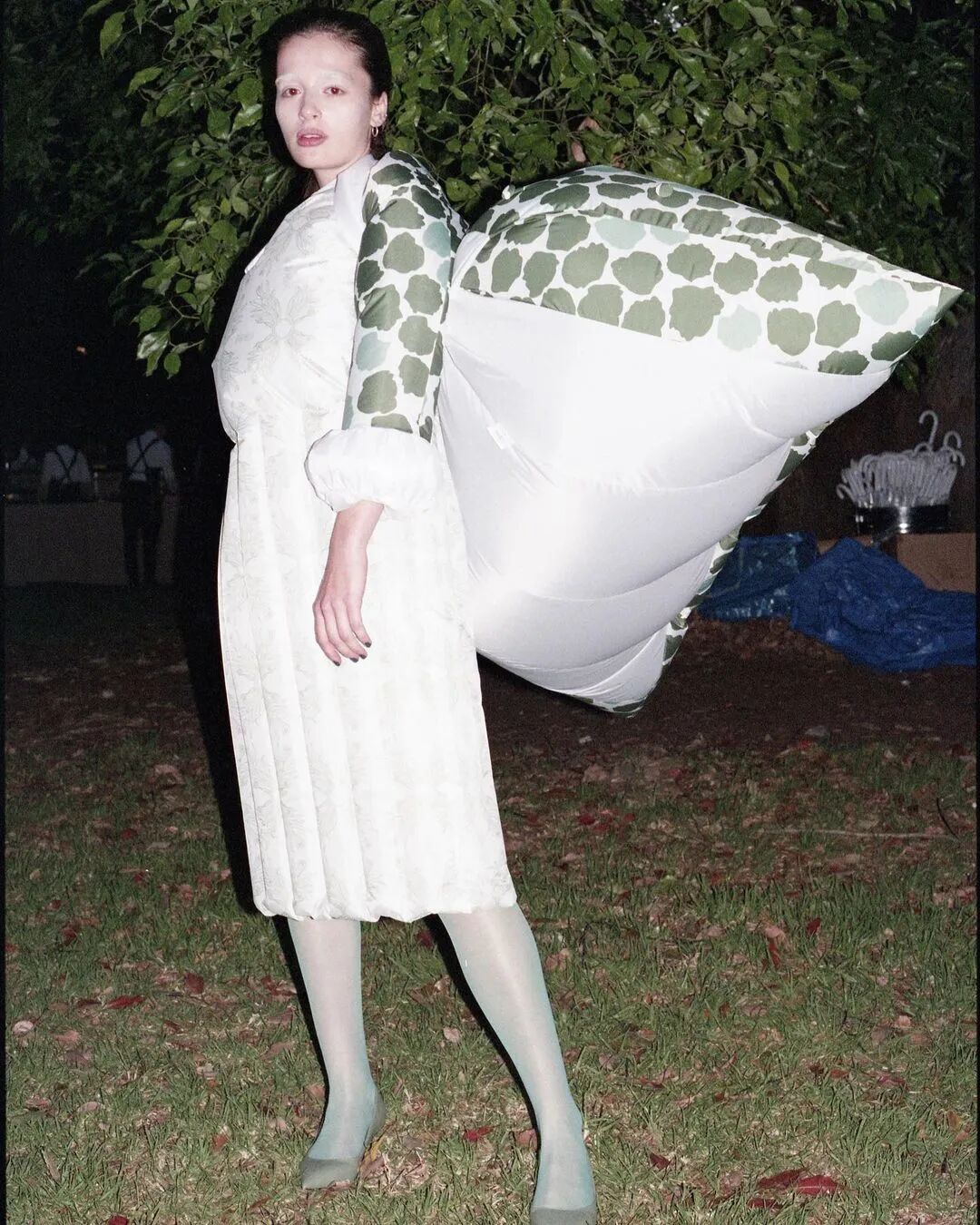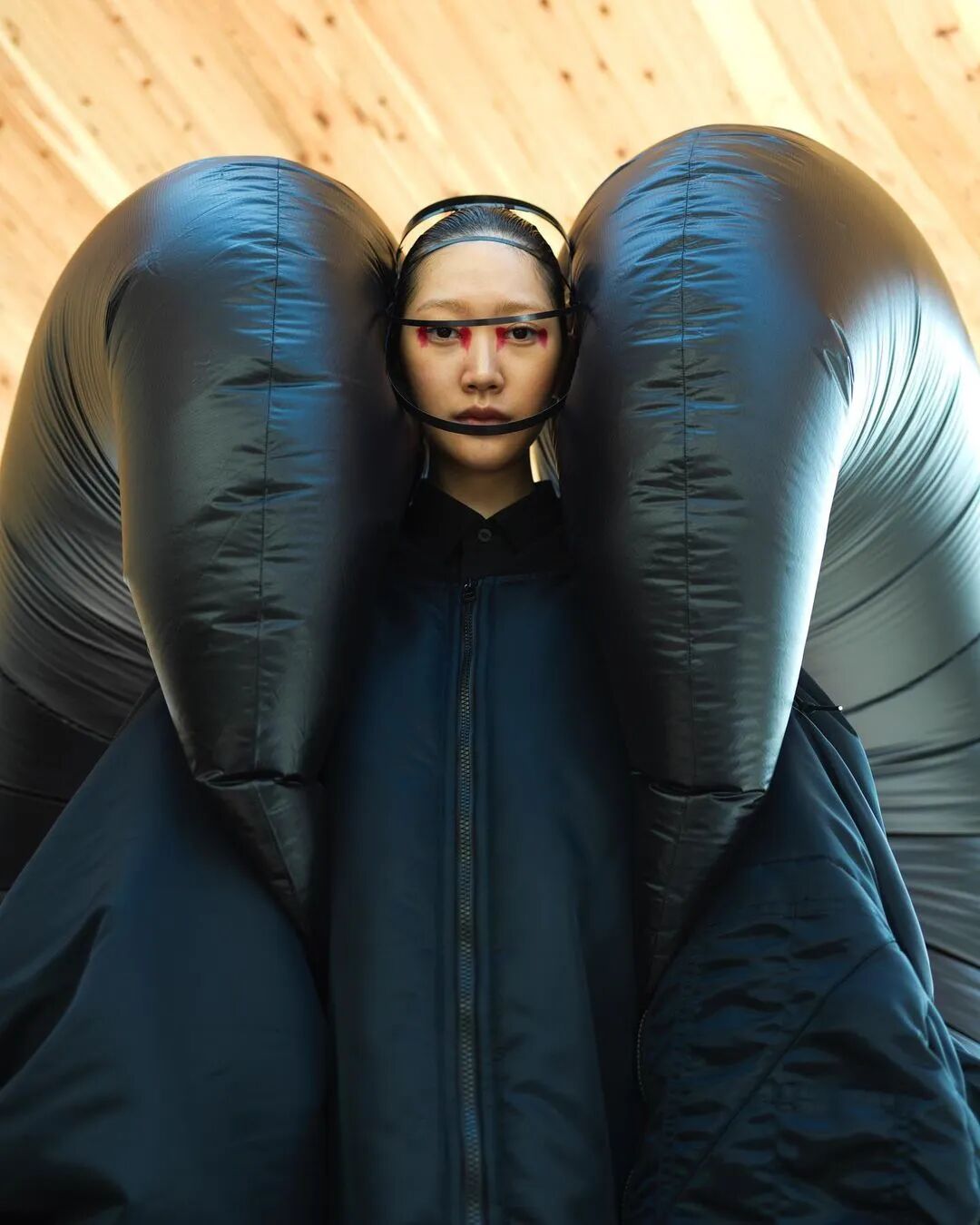 光敏日记的第二款服装——Floating above 、limits,整个看上去像一块巨大的充气枕头,Siigii 想借此表达的创作思想是:当我们与现有条件合作,而不是抗拒它们时,我们就可以进入无边的未知领域。