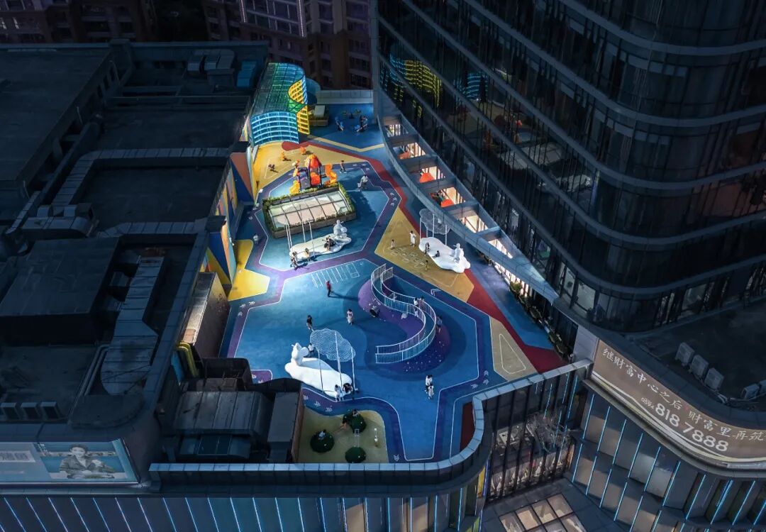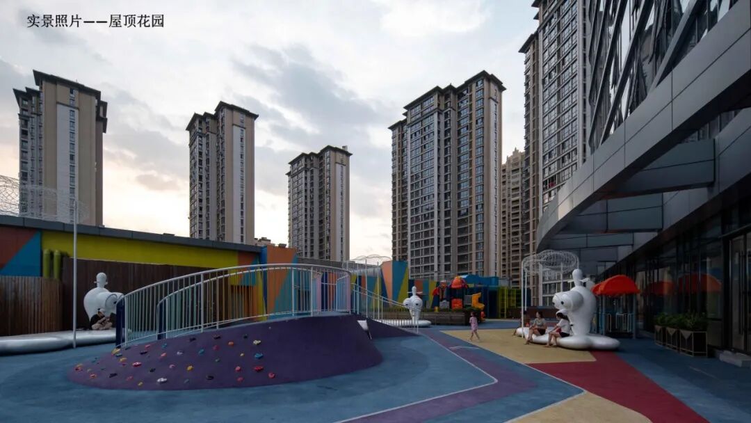 屋顶花园位于商场 5 楼,承担联通两侧室内商业空间、第五课堂、家庭亲子活动体验、青少年戶外教学广场的作用。通过良好的动线设计,为两側的立体商业街区提供吸引人流和留住人流的保证。