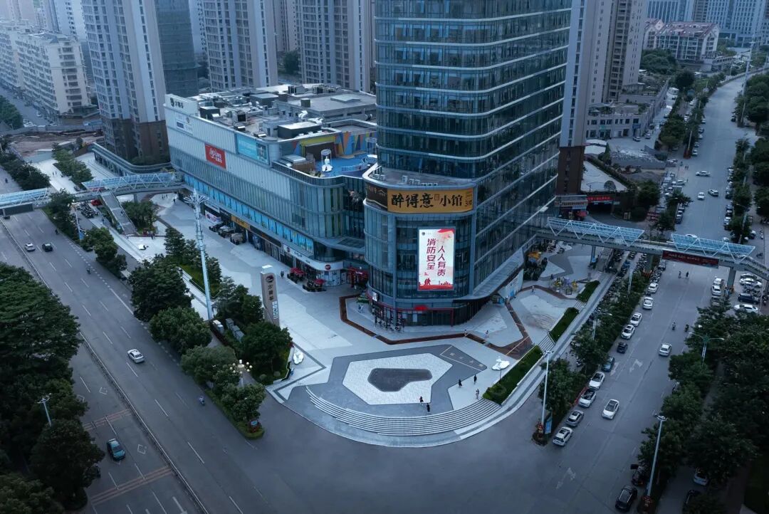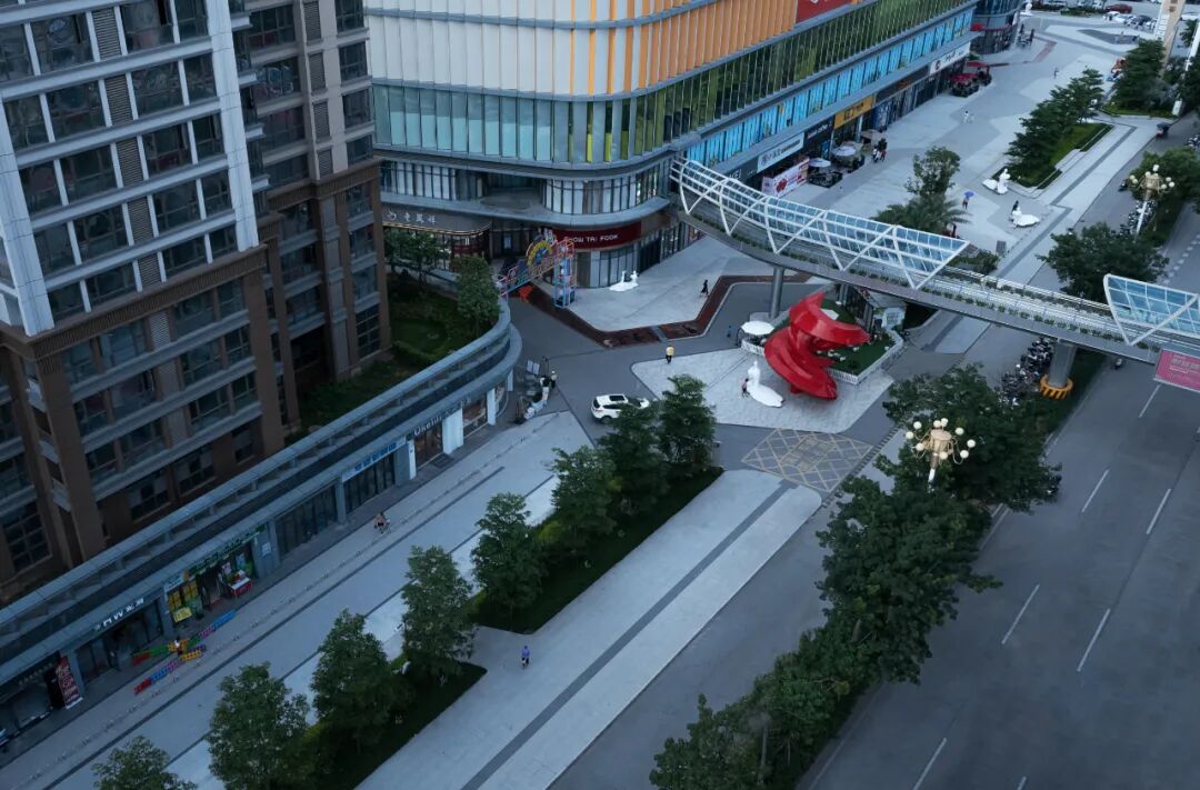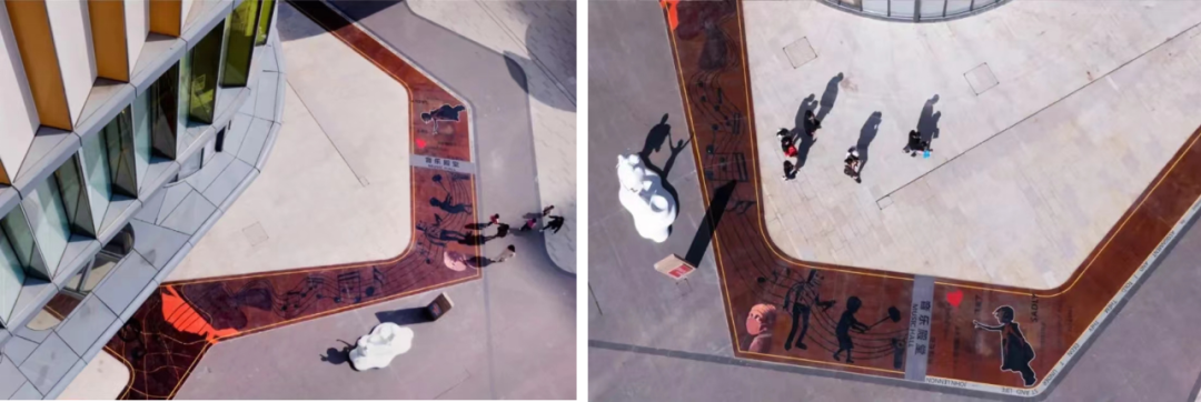项目两侧临街,临街面根据与市政路的高差关系采用台阶和花(树)池进行衔接。地面铺装为灰、白色调石材、耐候钢板彩绘。