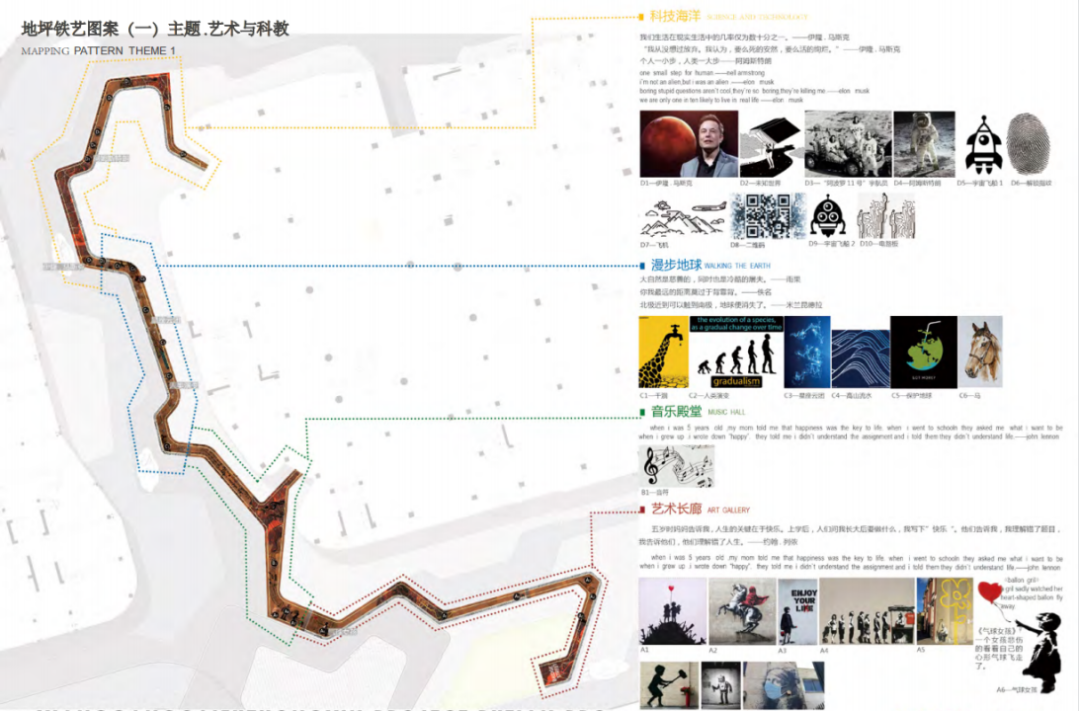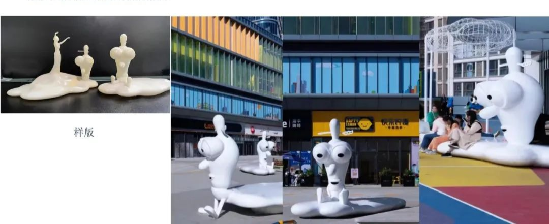 耐候钢板步行动线为本商业地铺的亮点与难点。长度近300米的耐候钢板的步行动线完工后凭借其丰富的图案故事令人耳目一新。图案采贴合设计想表达的艺术性与主题自由创作的鲜活性。