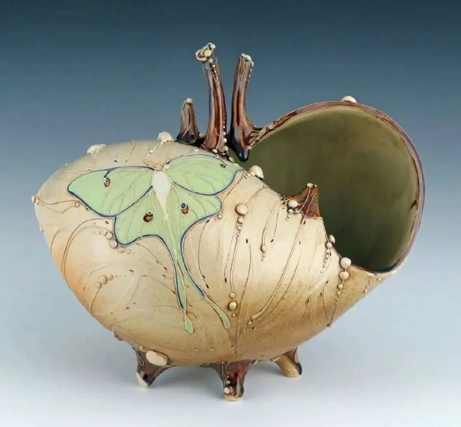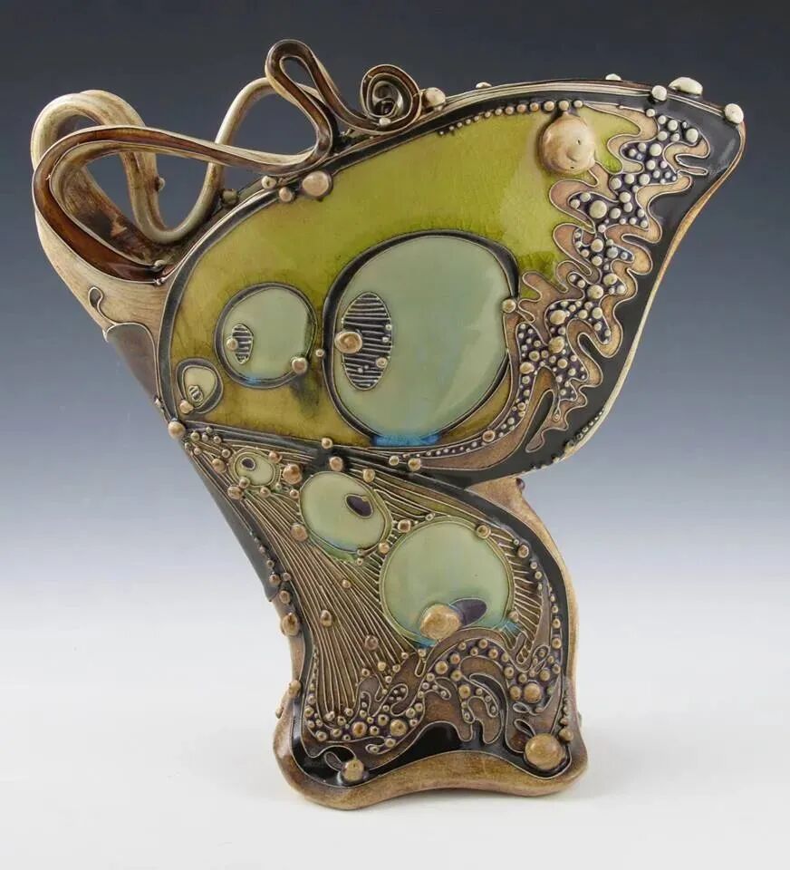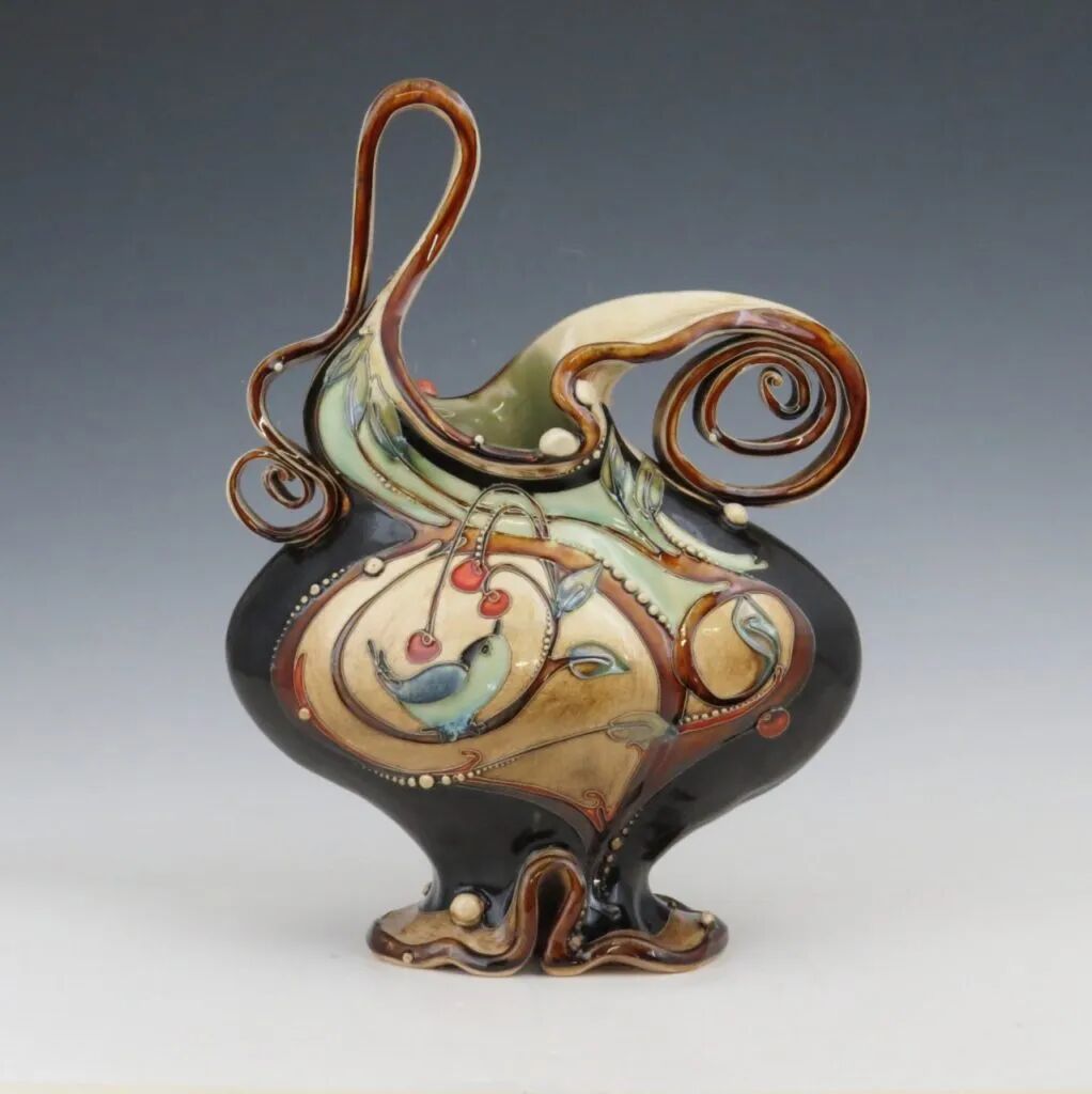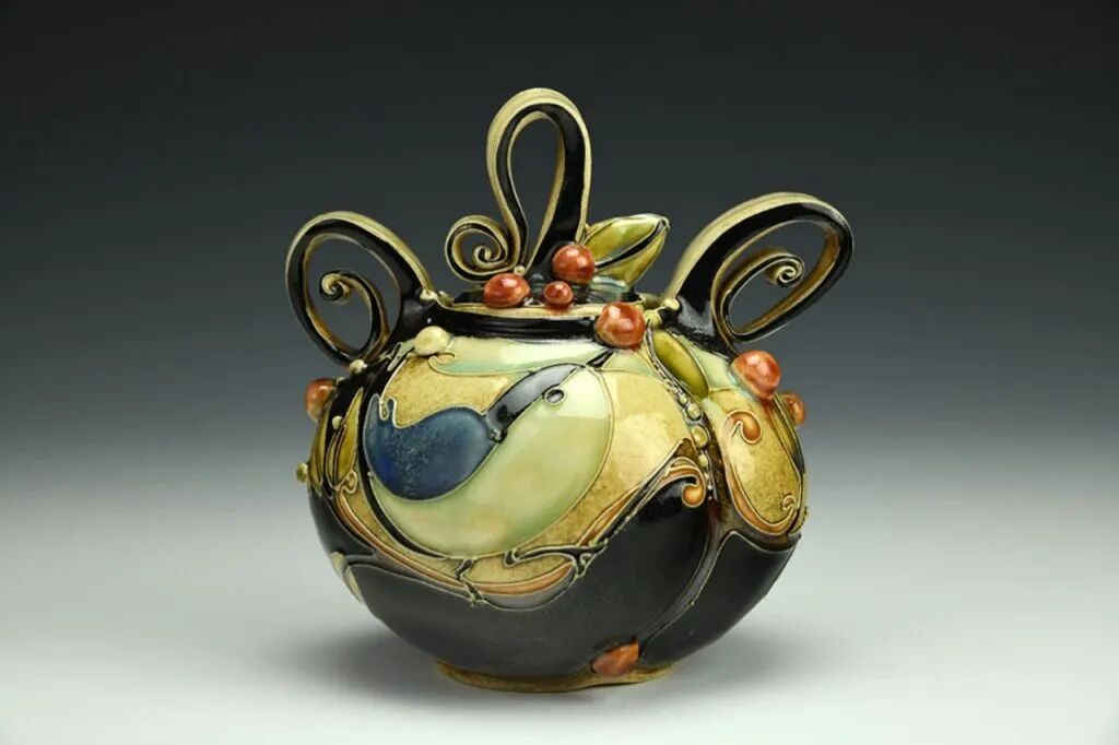 融合了新艺术运动的颓废和爱丽丝梦游仙境的奇思妙想,艺术家Carol Long 用一系列小球体、卷曲的把手和密密麻麻的条纹改造了不起眼的粘土容器。她的装饰作品以简单的车轮形状开始,这些形状被推、弯曲和扭曲成膨胀的形式,让人联想到有机材料或更具有代表性的主题,如鹿或蘑菇。龙随后使用滑动拖尾和精致的上釉工艺为无定形雕塑添加了惊人数量的装饰,模仿了自然界中发现的图案、纹理和颜色。