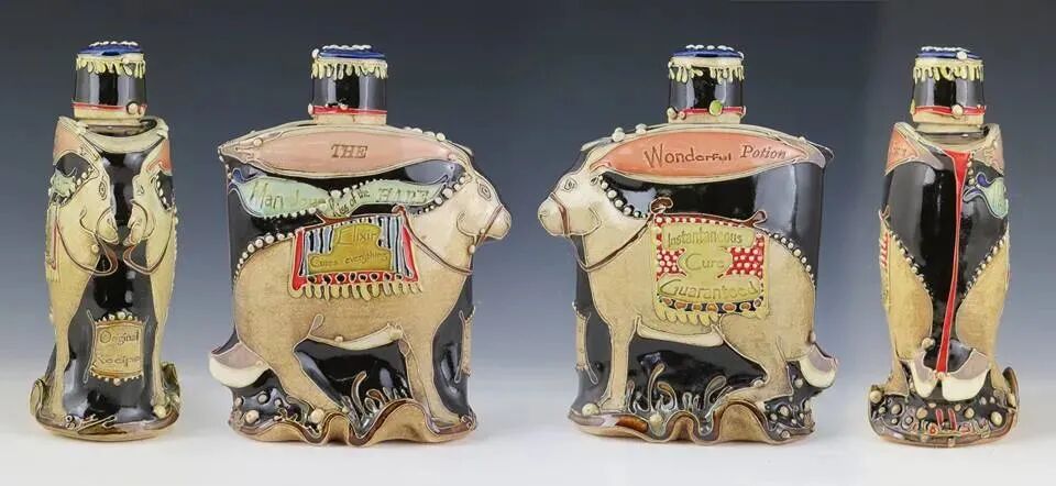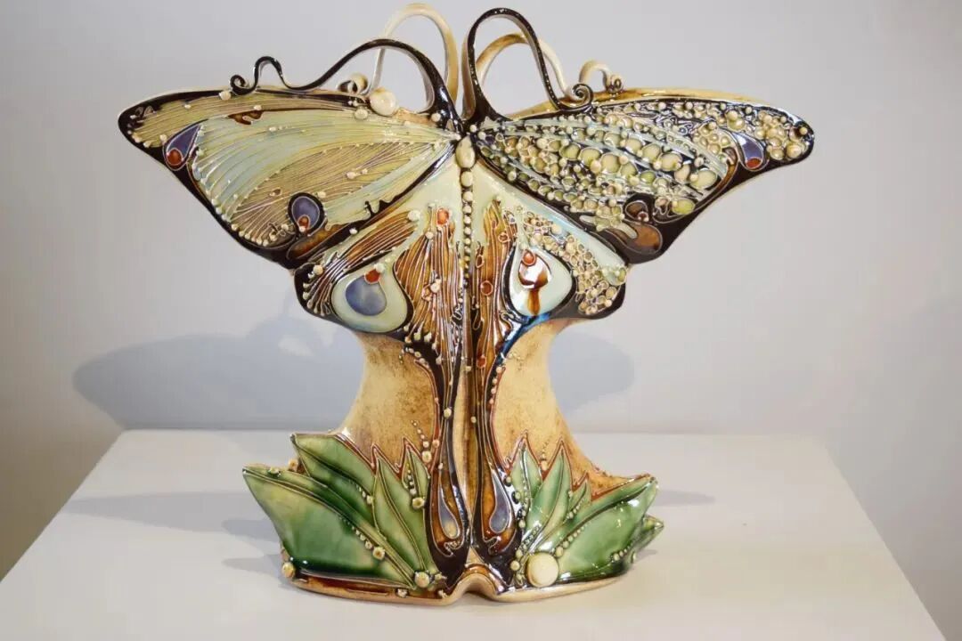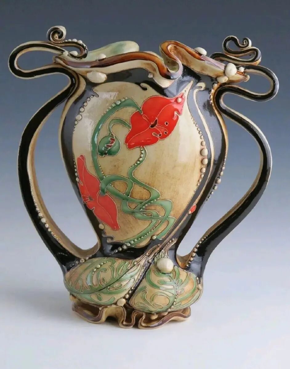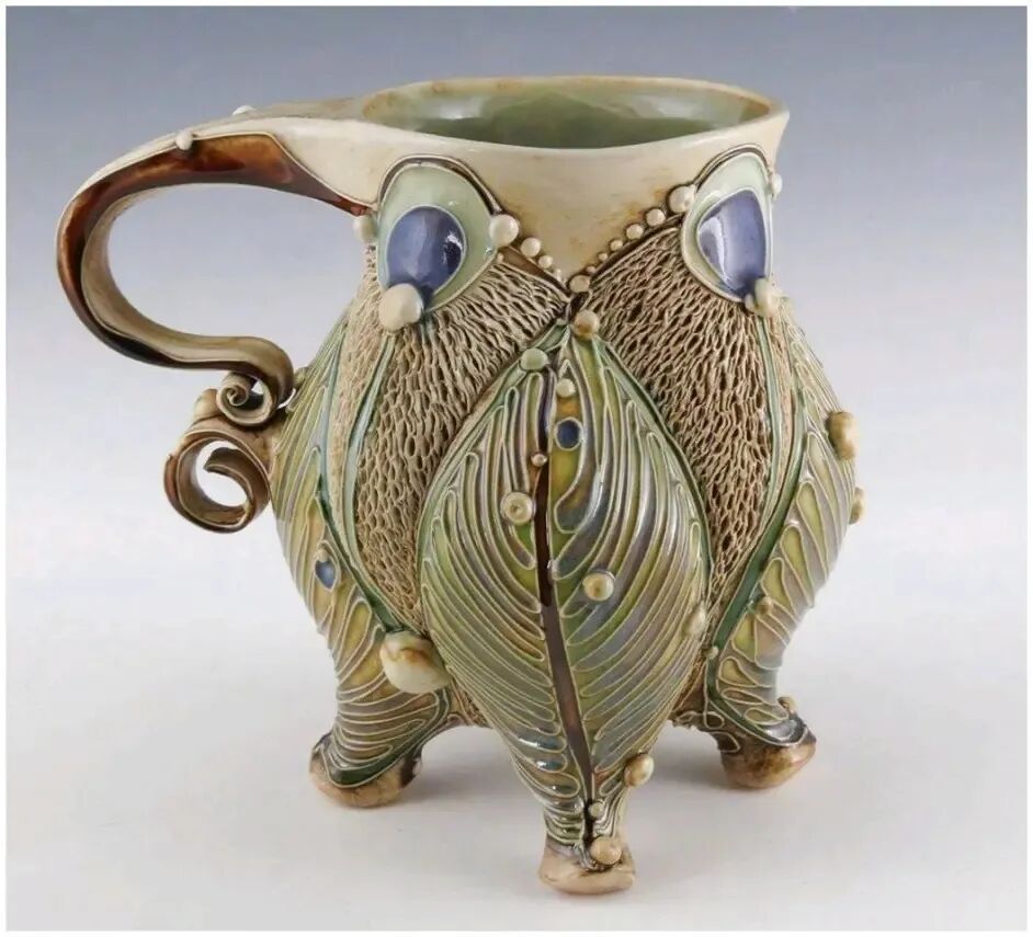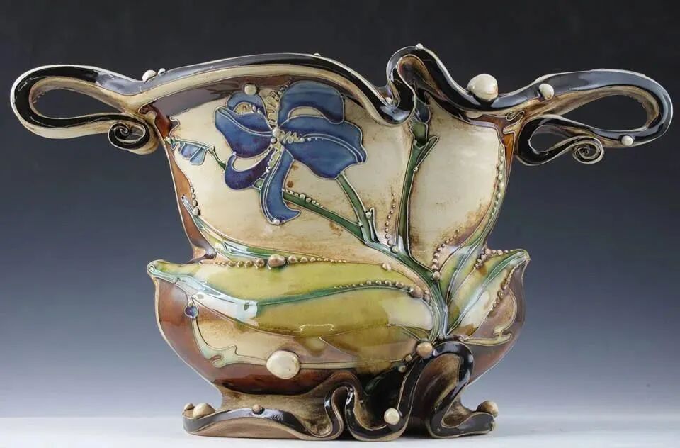 融合了新艺术运动的颓废和爱丽丝梦游仙境的奇思妙想,艺术家Carol Long 用一系列小球体、卷曲的把手和密密麻麻的条纹改造了不起眼的粘土容器。她的装饰作品以简单的车轮形状开始,这些形状被推、弯曲和扭曲成膨胀的形式,让人联想到有机材料或更具有代表性的主题,如鹿或蘑菇。龙随后使用滑动拖尾和精致的上釉工艺为无定形雕塑添加了惊人数量的装饰,模仿了自然界中发现的图案、纹理和颜色。