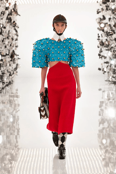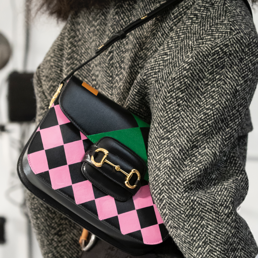 一些图形出现在Aria秀场中,乍一看似乎和Gucci都没关系。比如这些色彩缤纷的几何印花,有波点、条纹、菱格及其他不规则图案,印在不同形状的马鞍包上。
