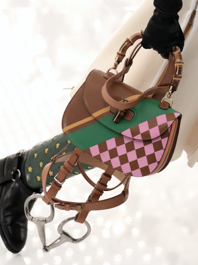 但更多的是马术灵感。Guccio Gucci先生在一个世纪前创立品牌时,一定不曾想到这么多给骑手的工具,有一天会成为人类时装的一部分。这场秀上,马衔、骑师帽、竹节手袋和绿红绿条纹无处不在。