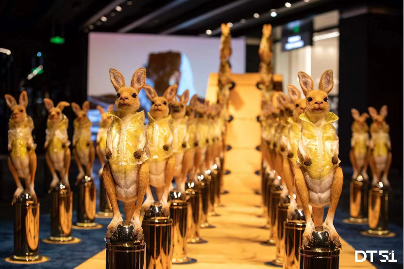 沿袭SKP-S的艺术装置设计,DT51在一层西门进门区域陈列了一群“刚子”,一群自上而下似滑雪的金色小袋鼠,犹如古人背诗一般摇晃着身体,这可爱的模样属实让人走不动,这里一进门就吸引了大批的消费家庭。