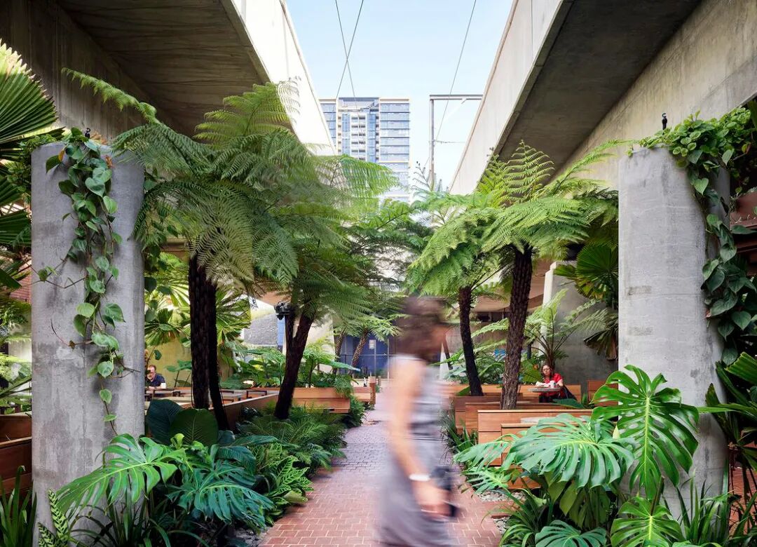 攀援着藤蔓的混凝土柱与拱形建筑和鹅卵石般的粘土路面相结合,创造出一种城市残余绿色口袋的感觉。蕨类植物在这个被铁路和建筑遮蔽的紧凑市中心,开拓出了一种全新的空间,营造了一种让人忘记都市繁华的静谧景观。
