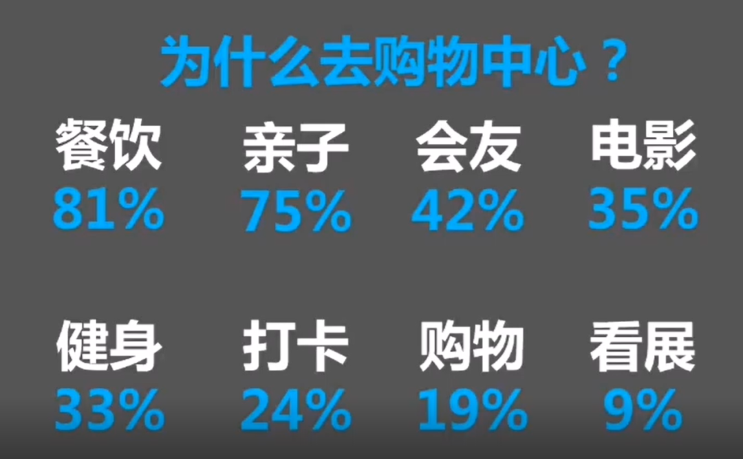 首先我们通过图表来分析一些市场调研的数据。消费者去购物中心购物的心理意愿降到20%以下,相反在购物中心中,消费者的体验生活占比很大。