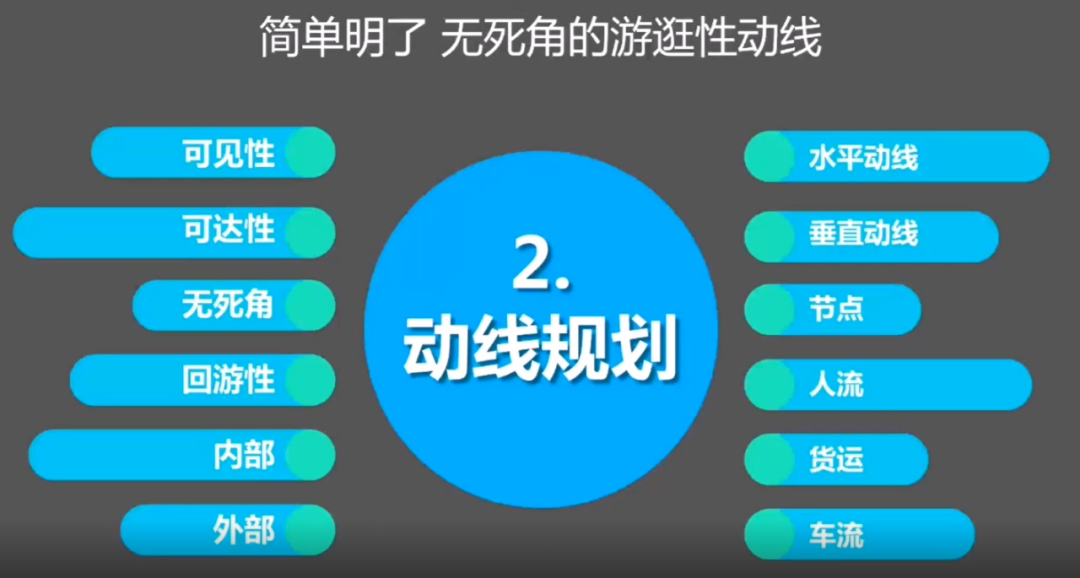 动线规划要满足未来商场的商品规划和空间要求,满足整个卖场各个品牌、各个业态的可见性和人流的可达性,规划动线尽量做到无死角,优化好复动线以及回游性等等。内部动线、外部的人流动线中基本上都是水平或垂直的动线,要尽可能增加消费者停留的节点,做好合理的评判和安排。