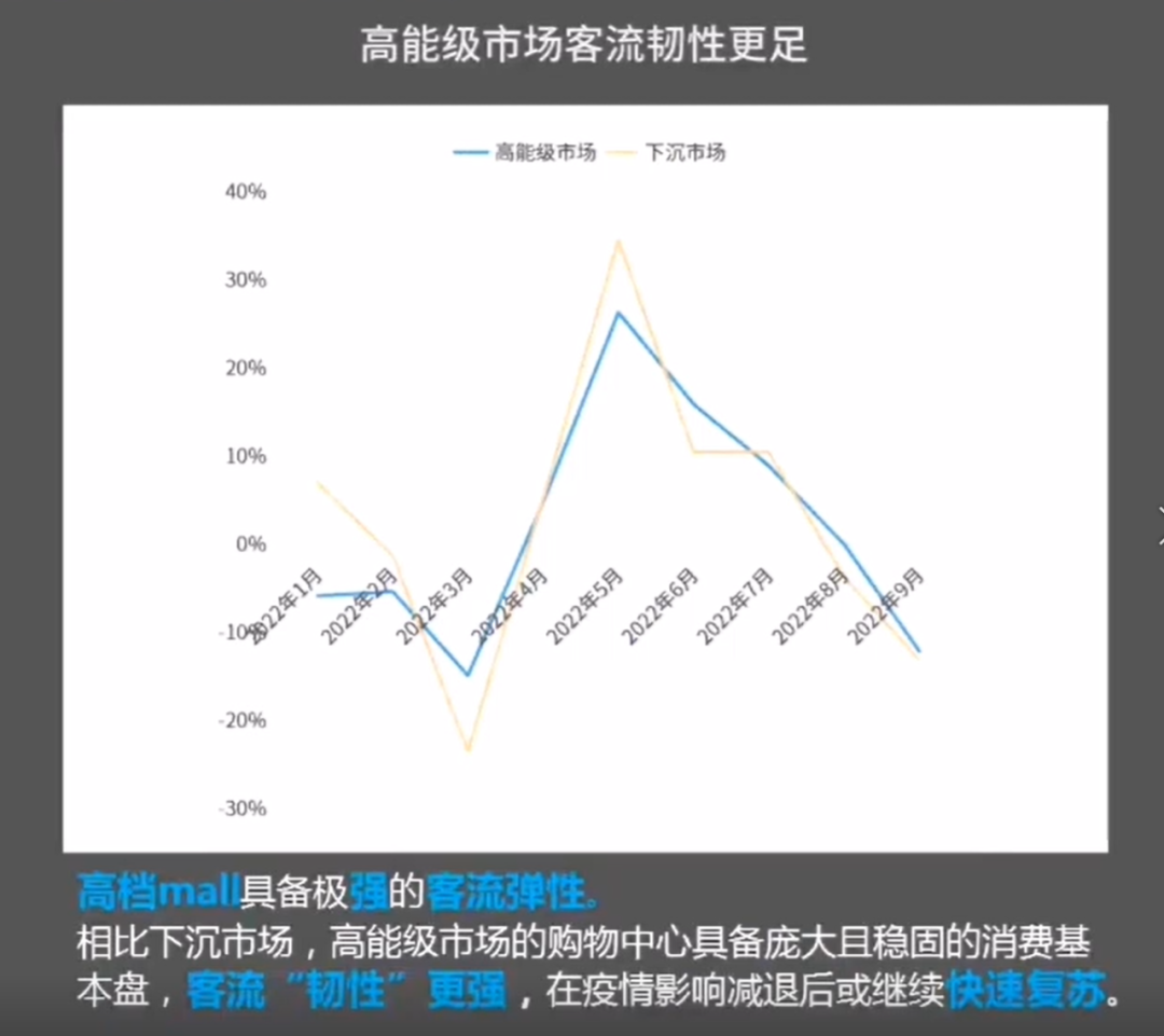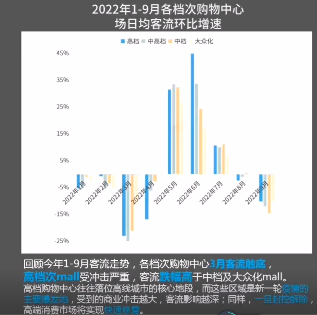 聚焦下沉市场,去年前三季度,商业五线城市客流表现良好,同比增长1.2%。其余线级城市客流均同比减少,其中商业一线城市(3-5月剔除上海)由于上半年疫情反复之影响,跌幅最大,高达13.1%,但相比上半年23.8%的跌幅回暖明显。回顾2022年1-9月客流走势,各档次购物中心3月客流触底,高档次mall受冲击严重,客流跌幅高于中档及大众化mall。高档购物中心往往落位高线城市的核心地段,而这些区域是新一轮疫情的主要爆发地,受到的商业冲击越大,客流影响越深;同样,一旦封控解除,高端消费市场将实现快速修复。